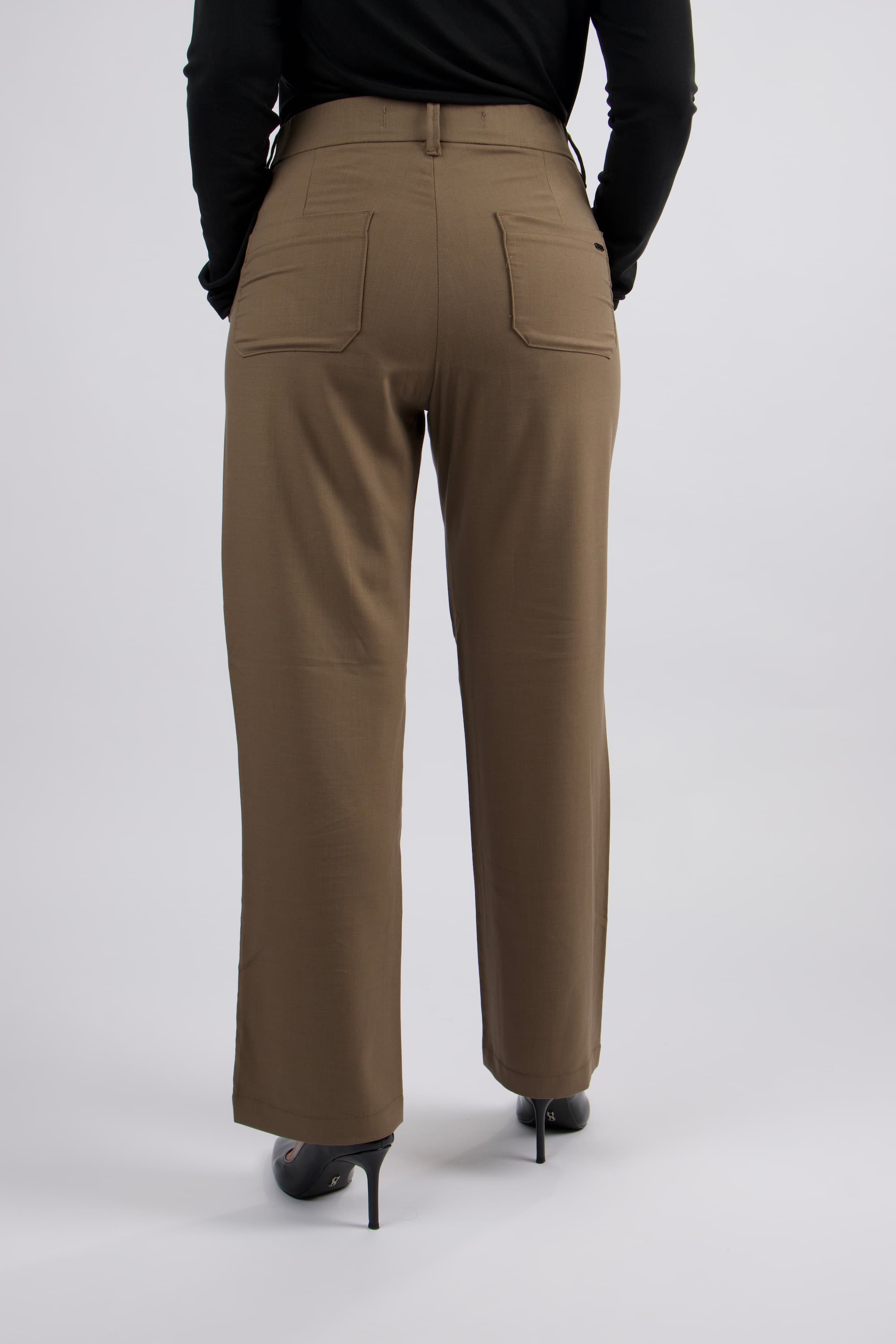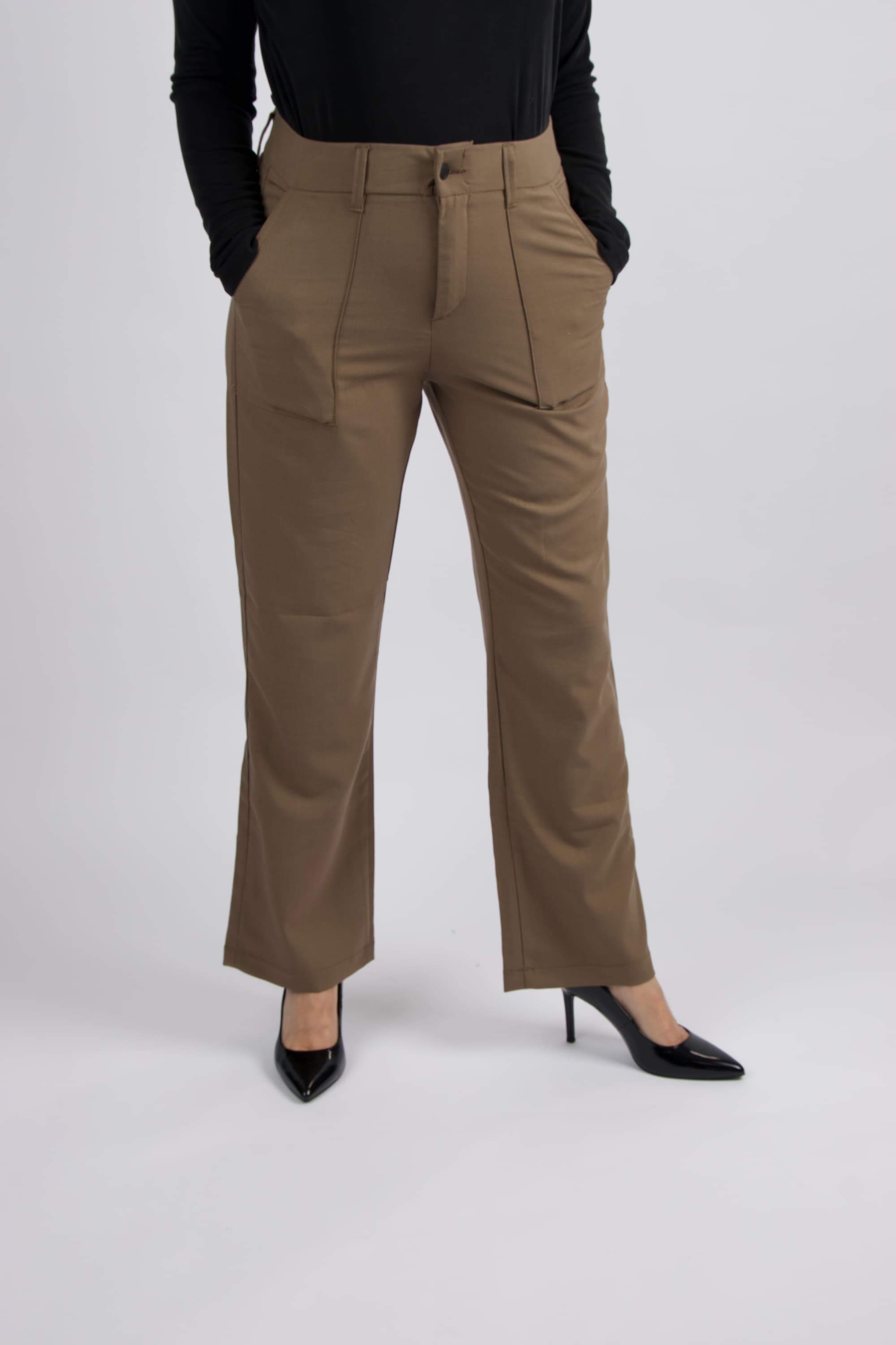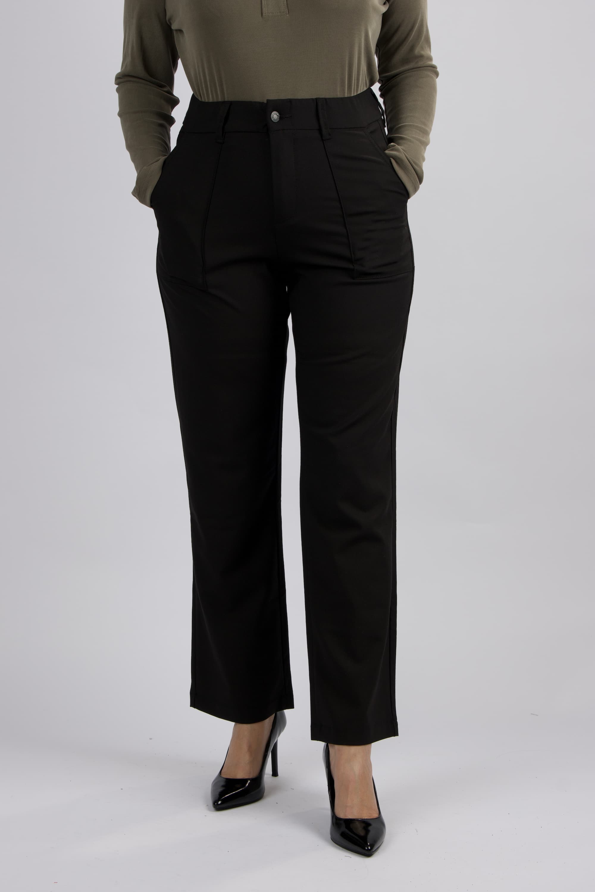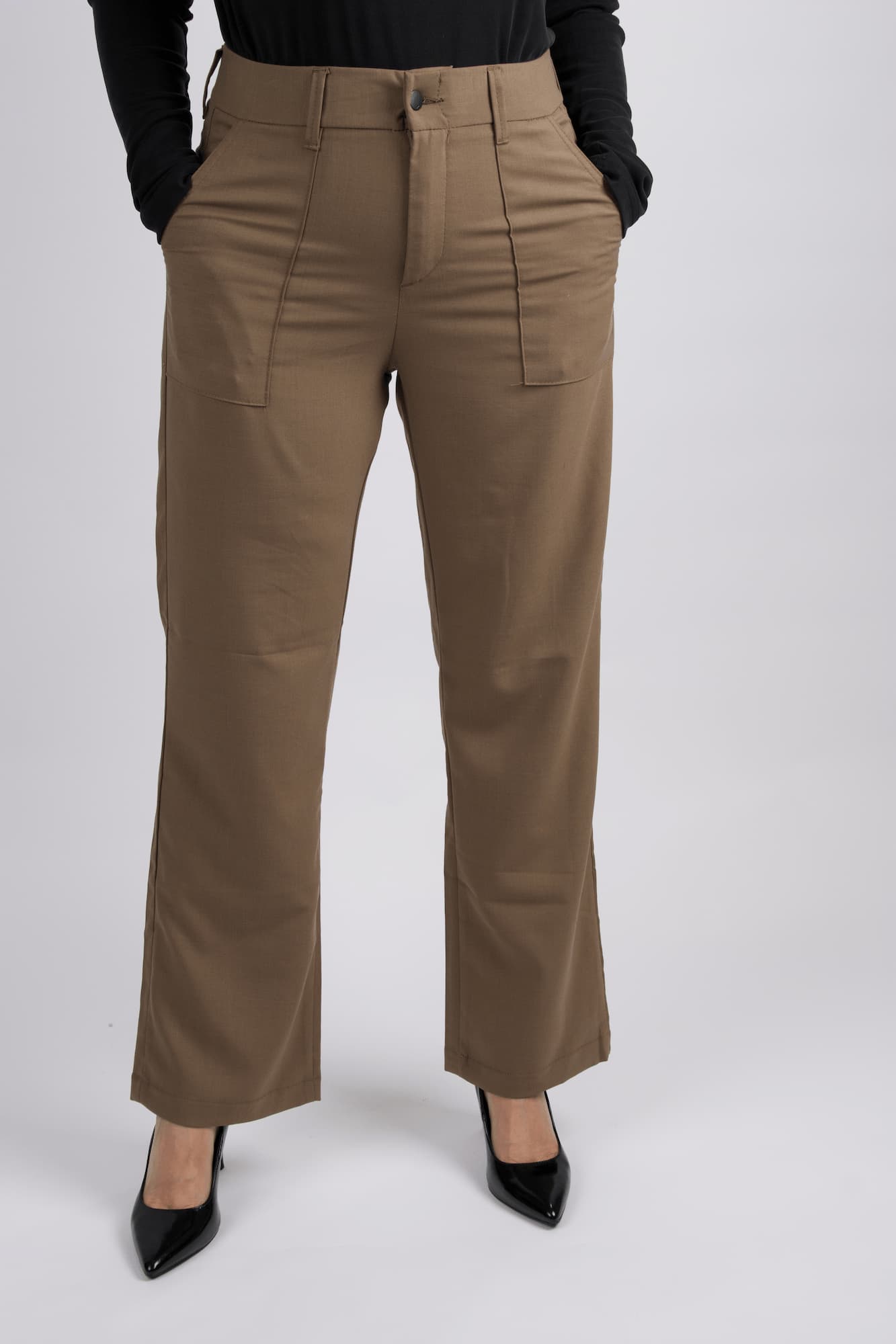 מכנסיים בגזרה ישרה רחבה , רכיסת כפתור ורוכסן, כיסים קדמיים חיצוניים ואחוריים