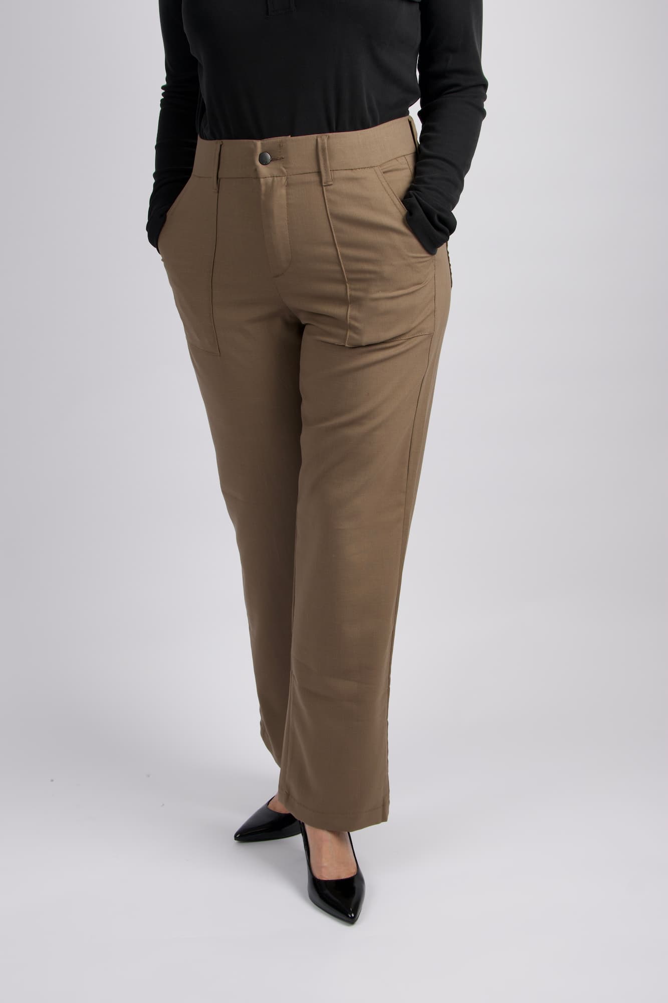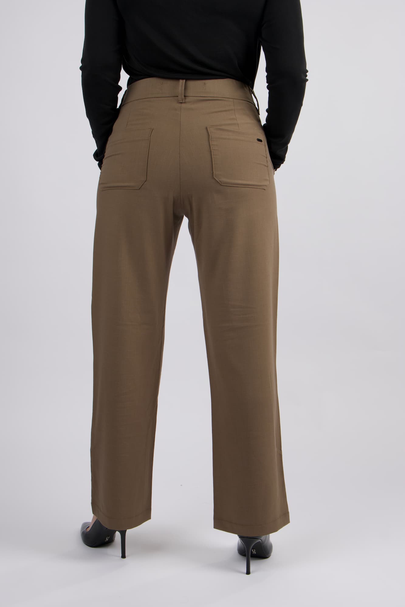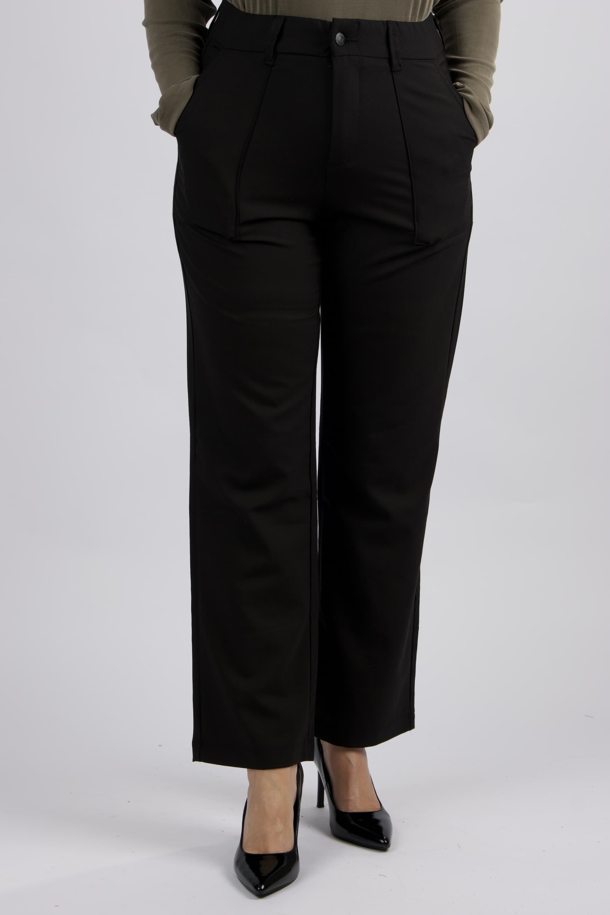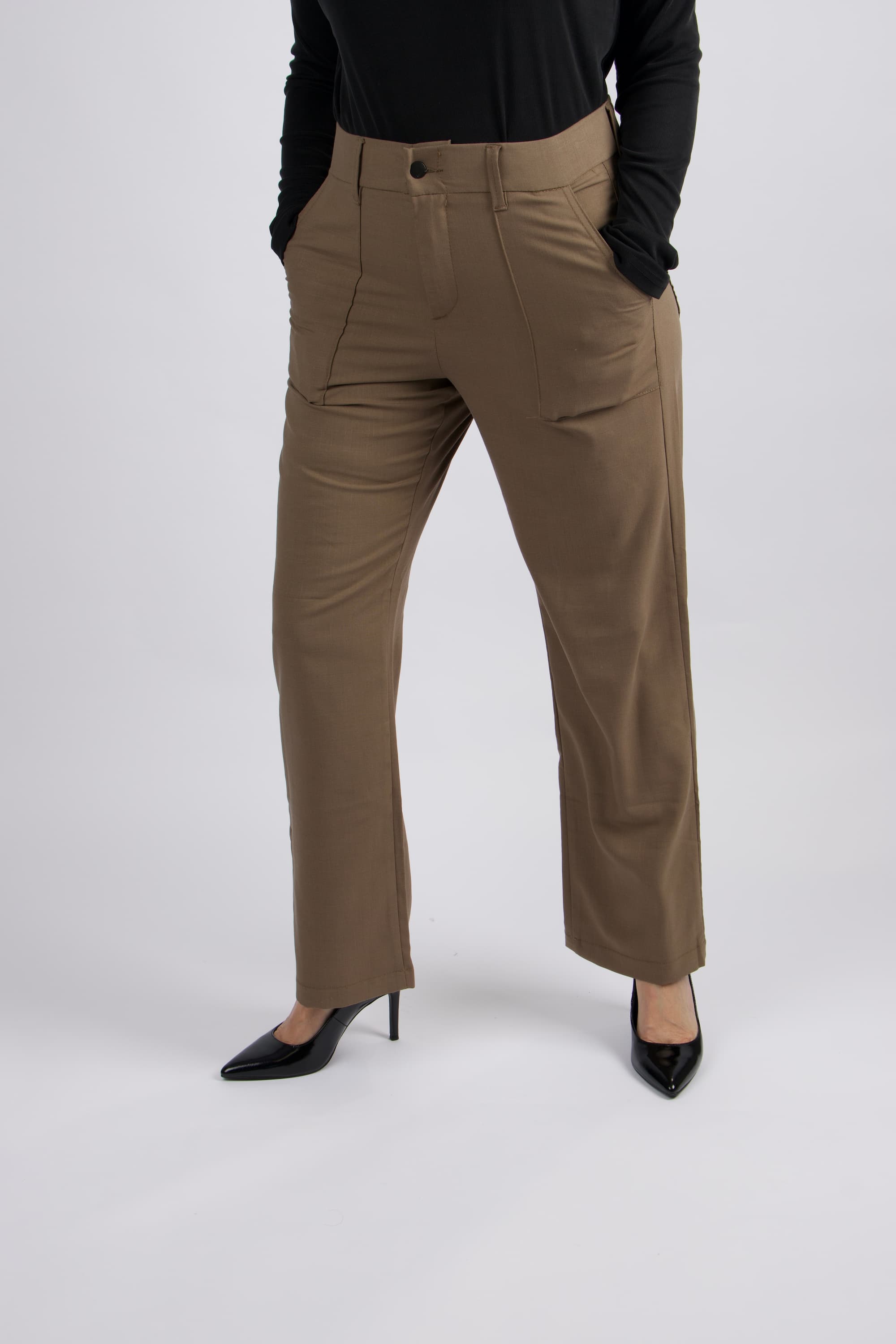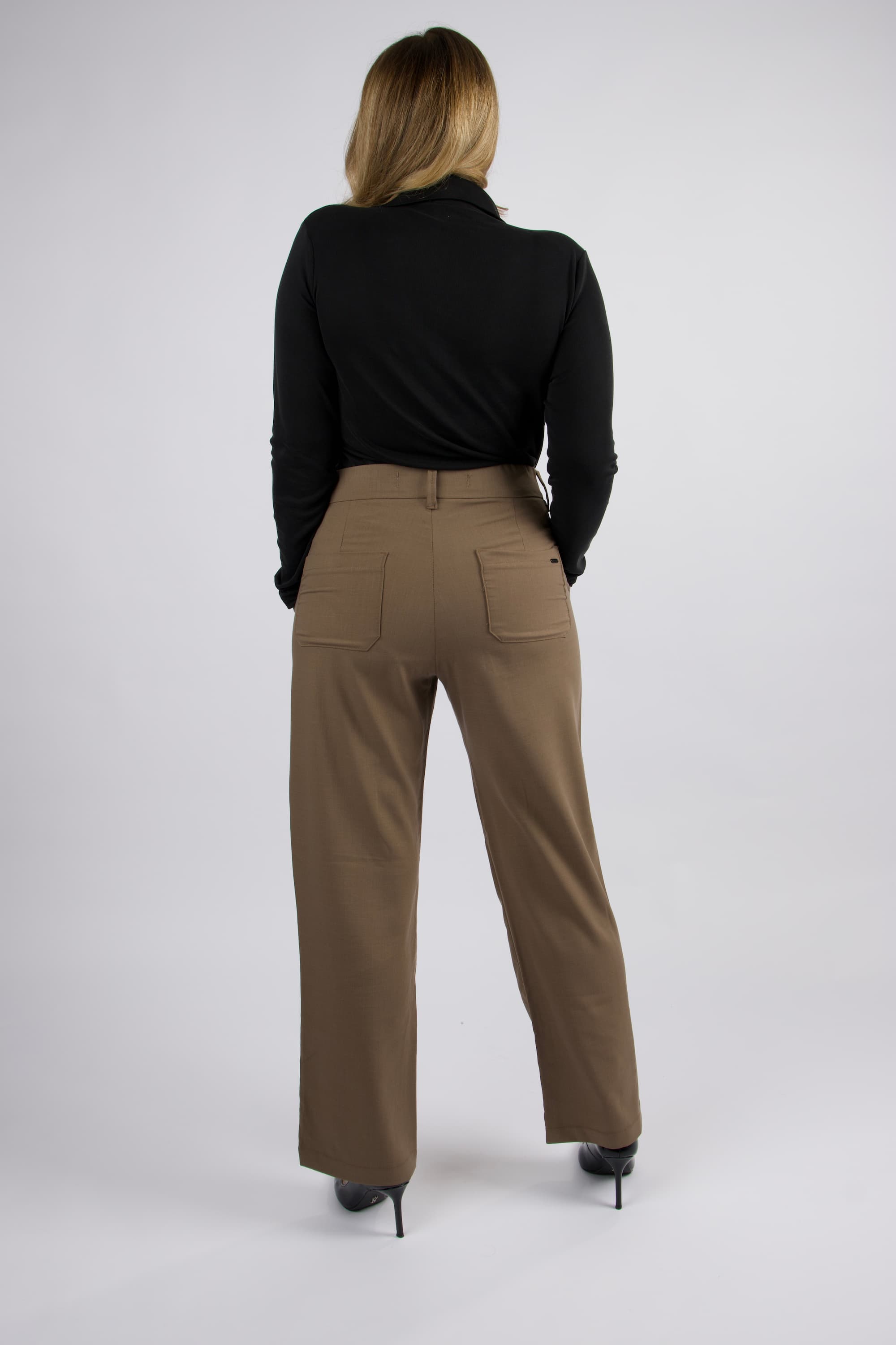 מכנסיים בגזרה ישרה רחבה , רכיסת כפתור ורוכסן, כיסים קדמיים חיצוניים ואחוריים