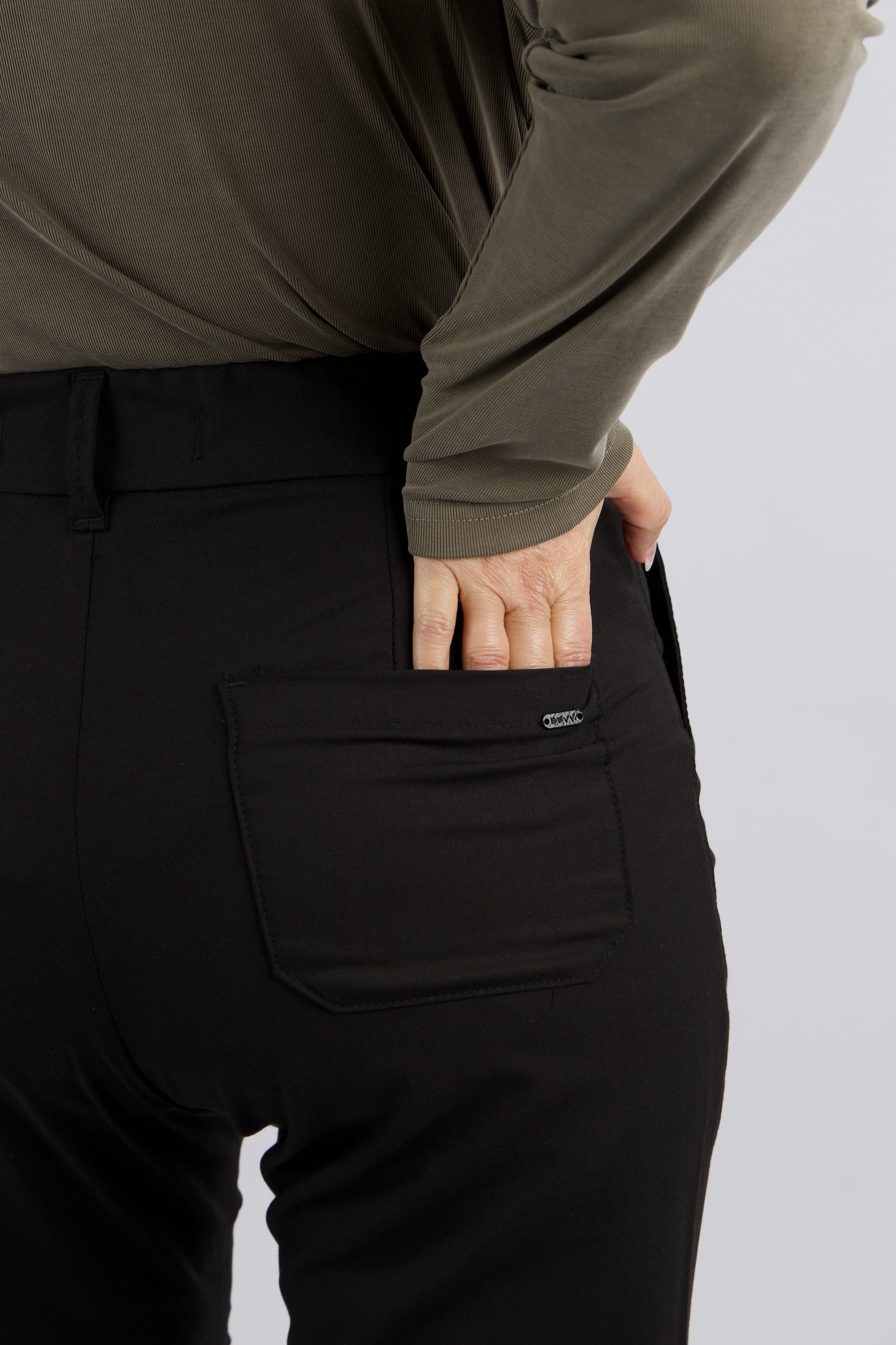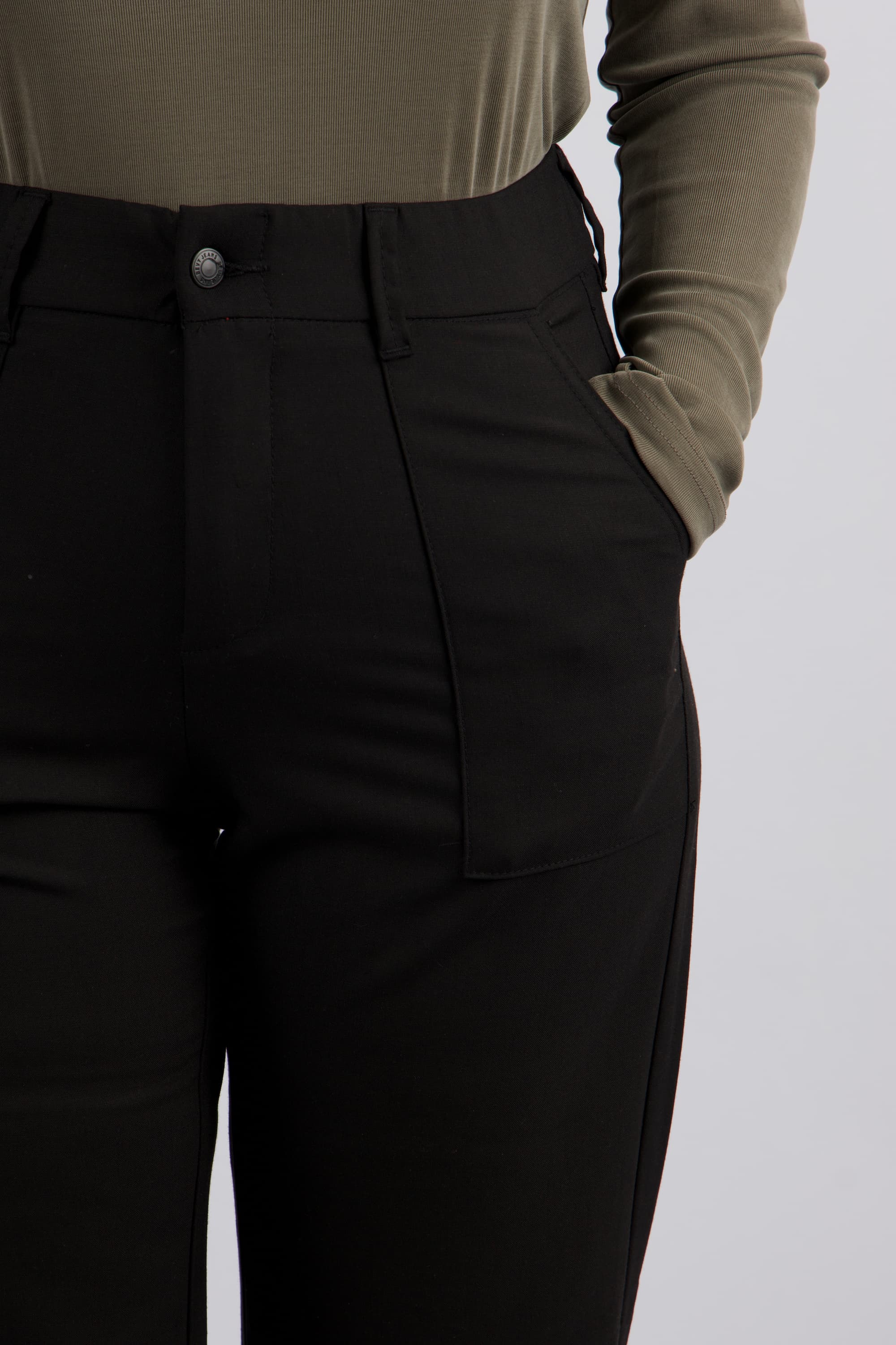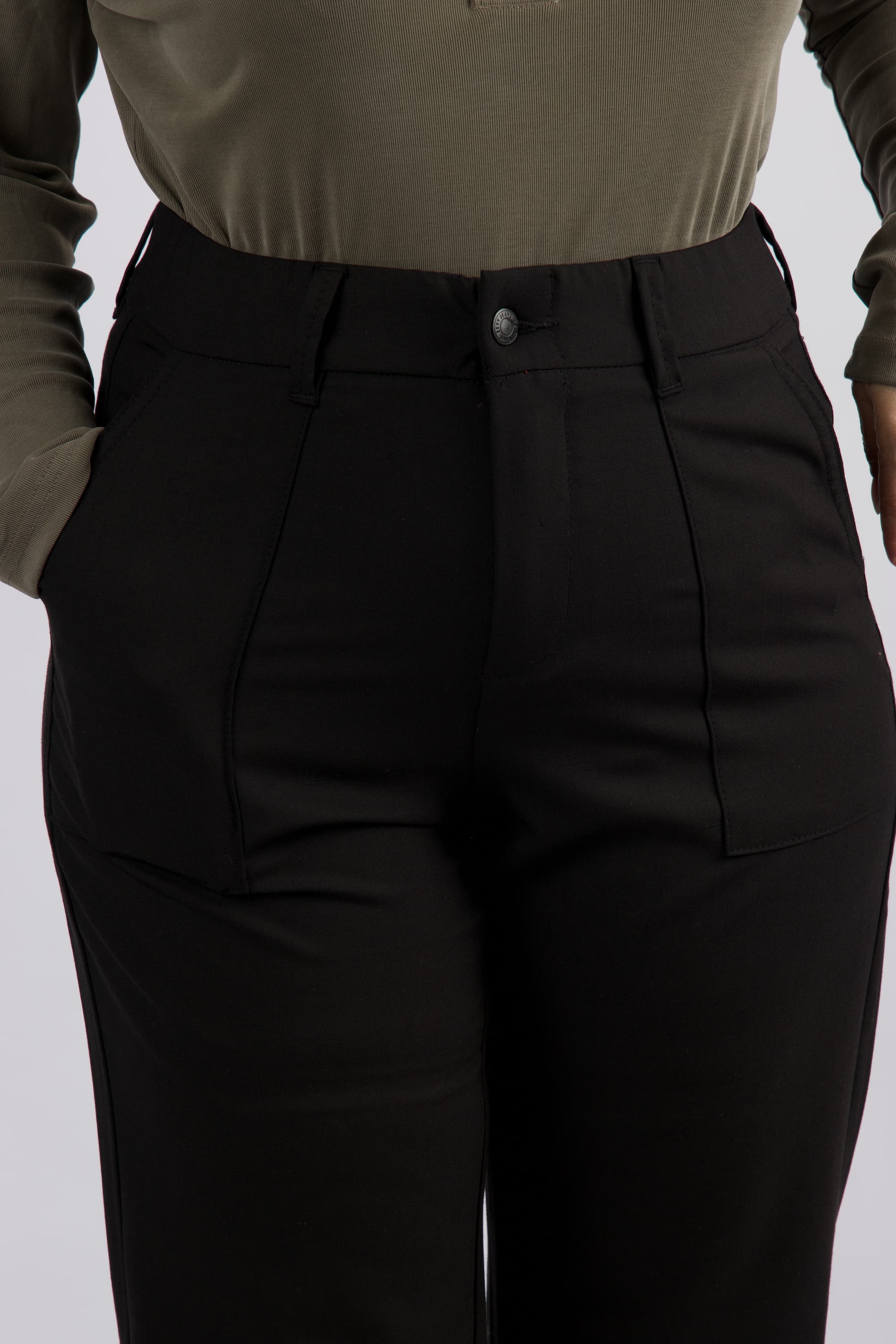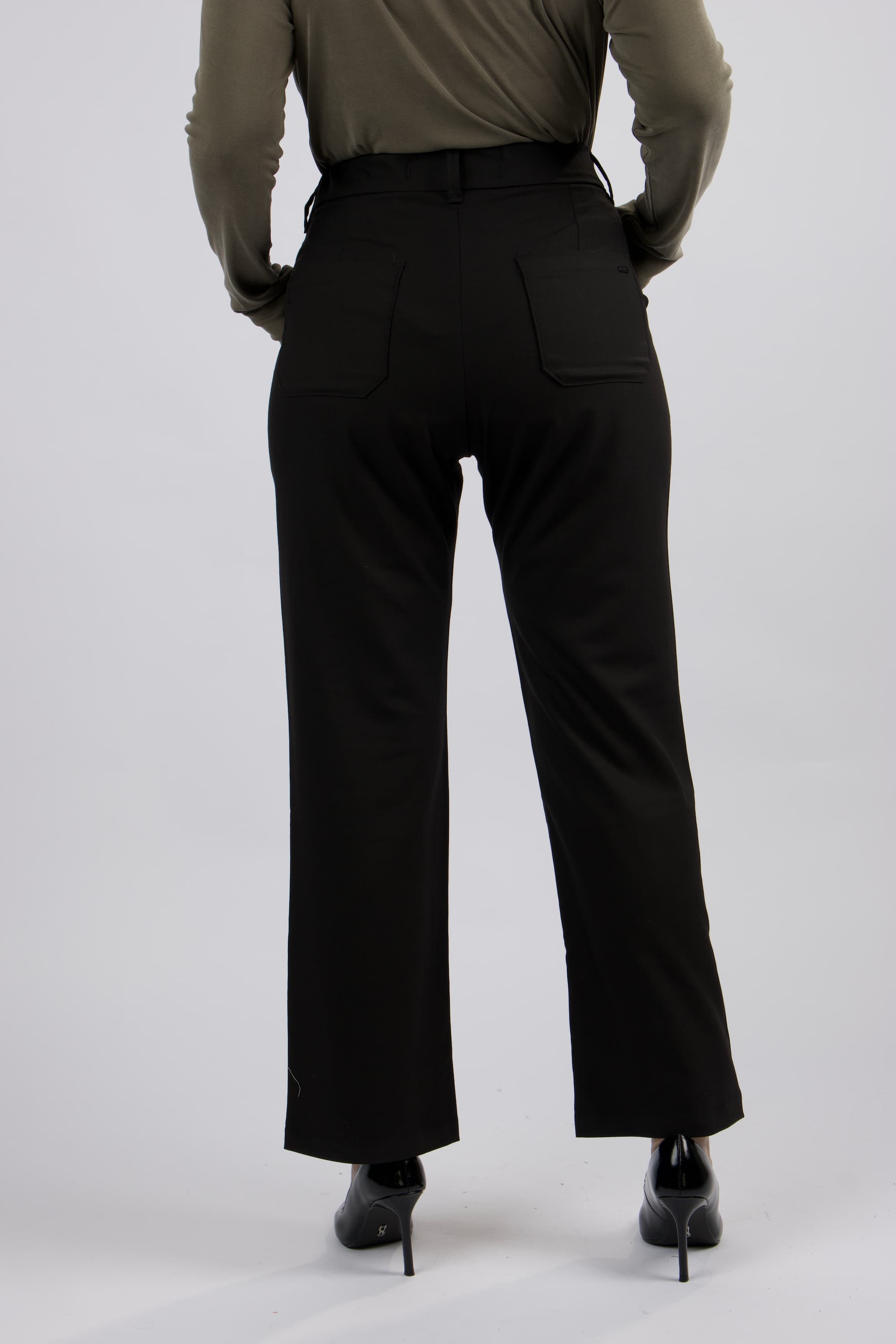 מכנסיים בגזרה ישרה רחבה , רכיסת כפתור ורוכסן, כיסים קדמיים חיצוניים ואחוריים