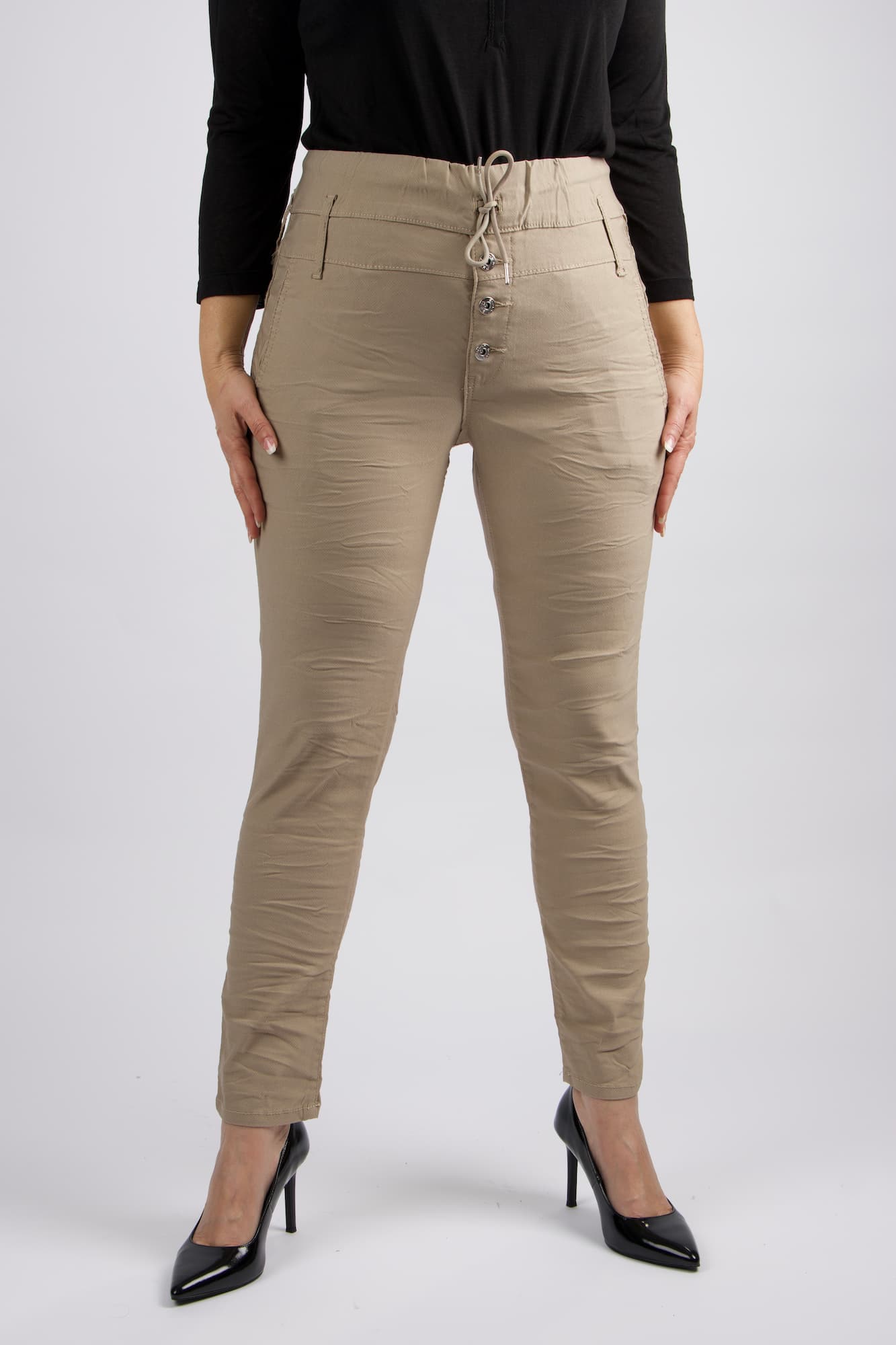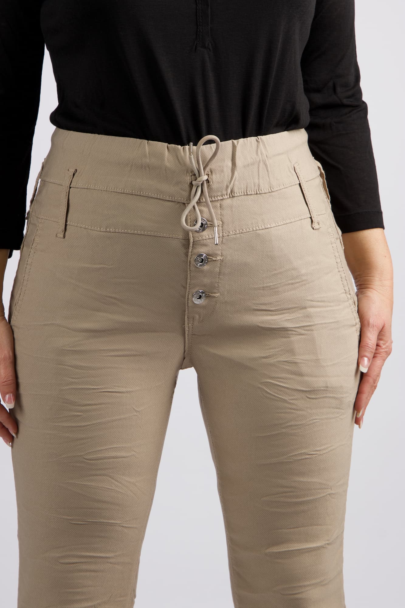 מכנסי כותנה בגזרת סקיני בשילוב חגורה רחבה במותן, רכיסת כפתורים, כיסים קדמיים ואחוריים