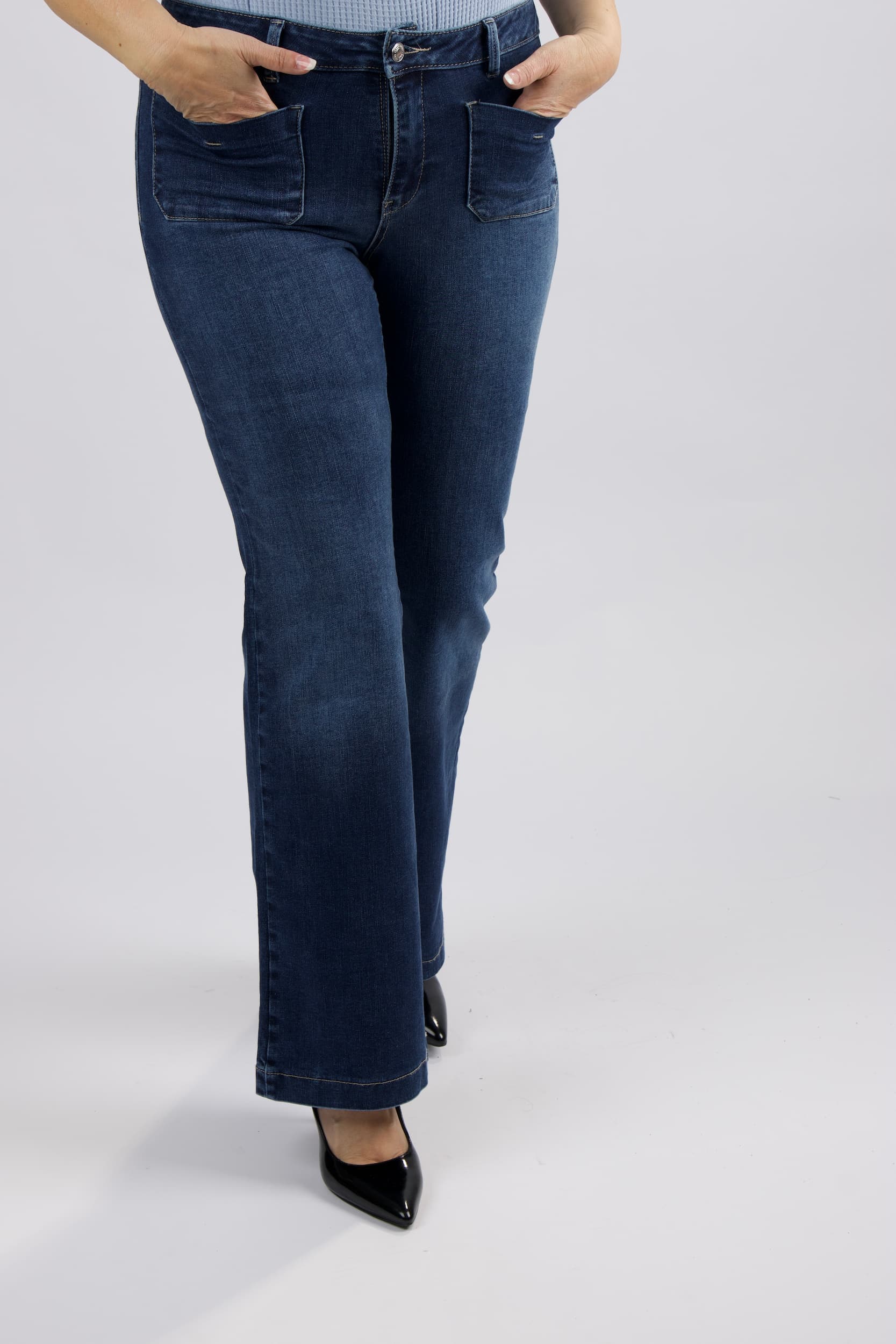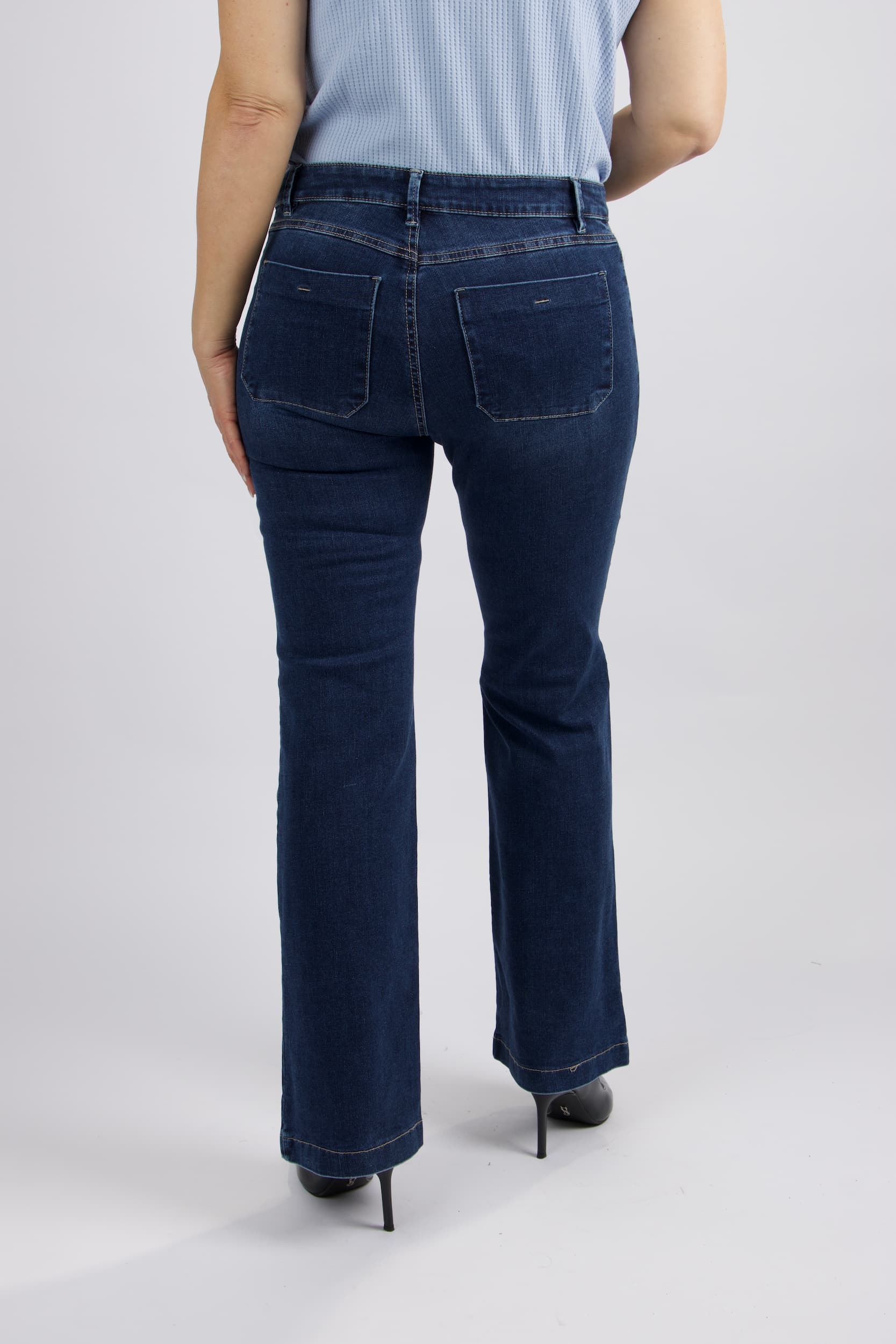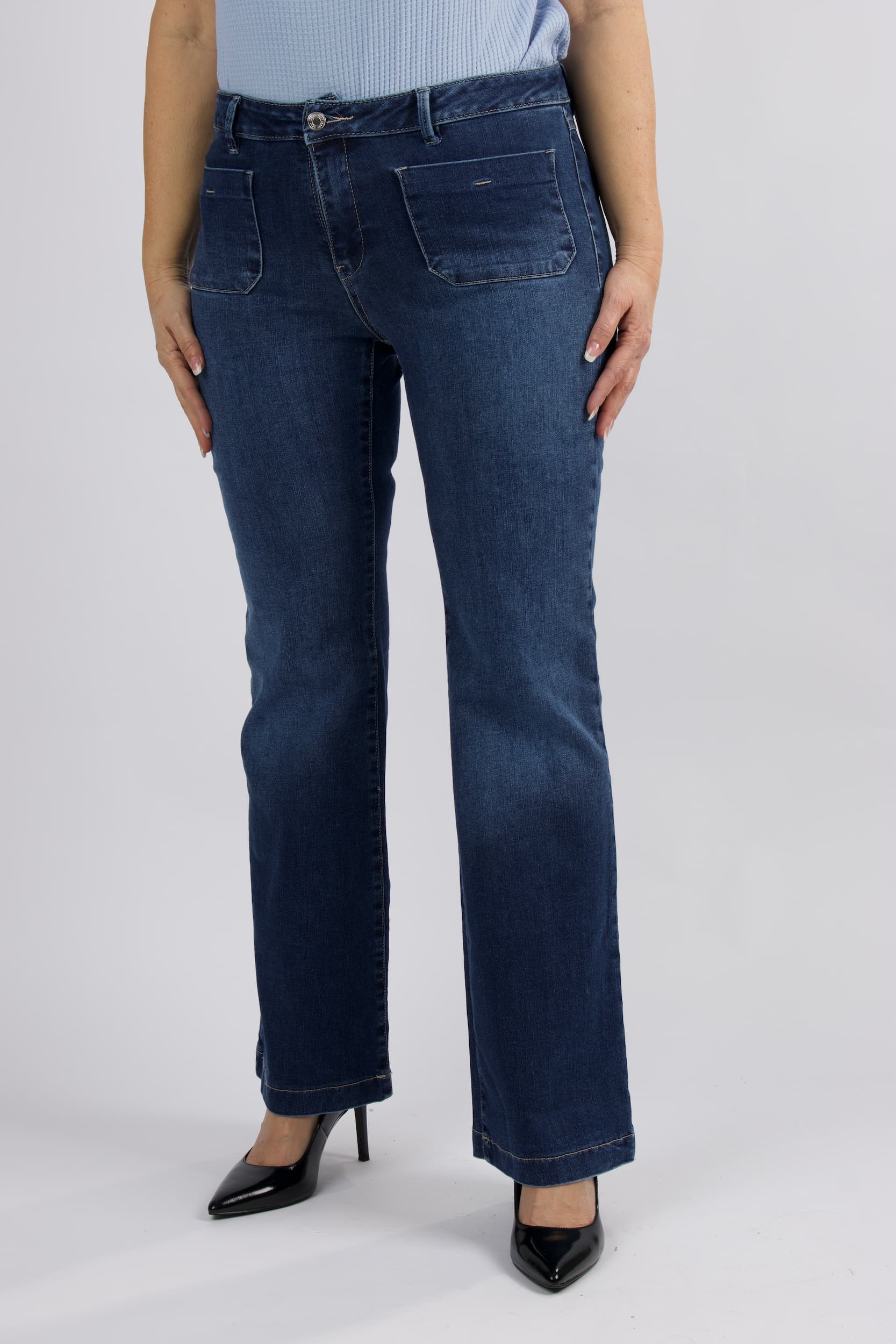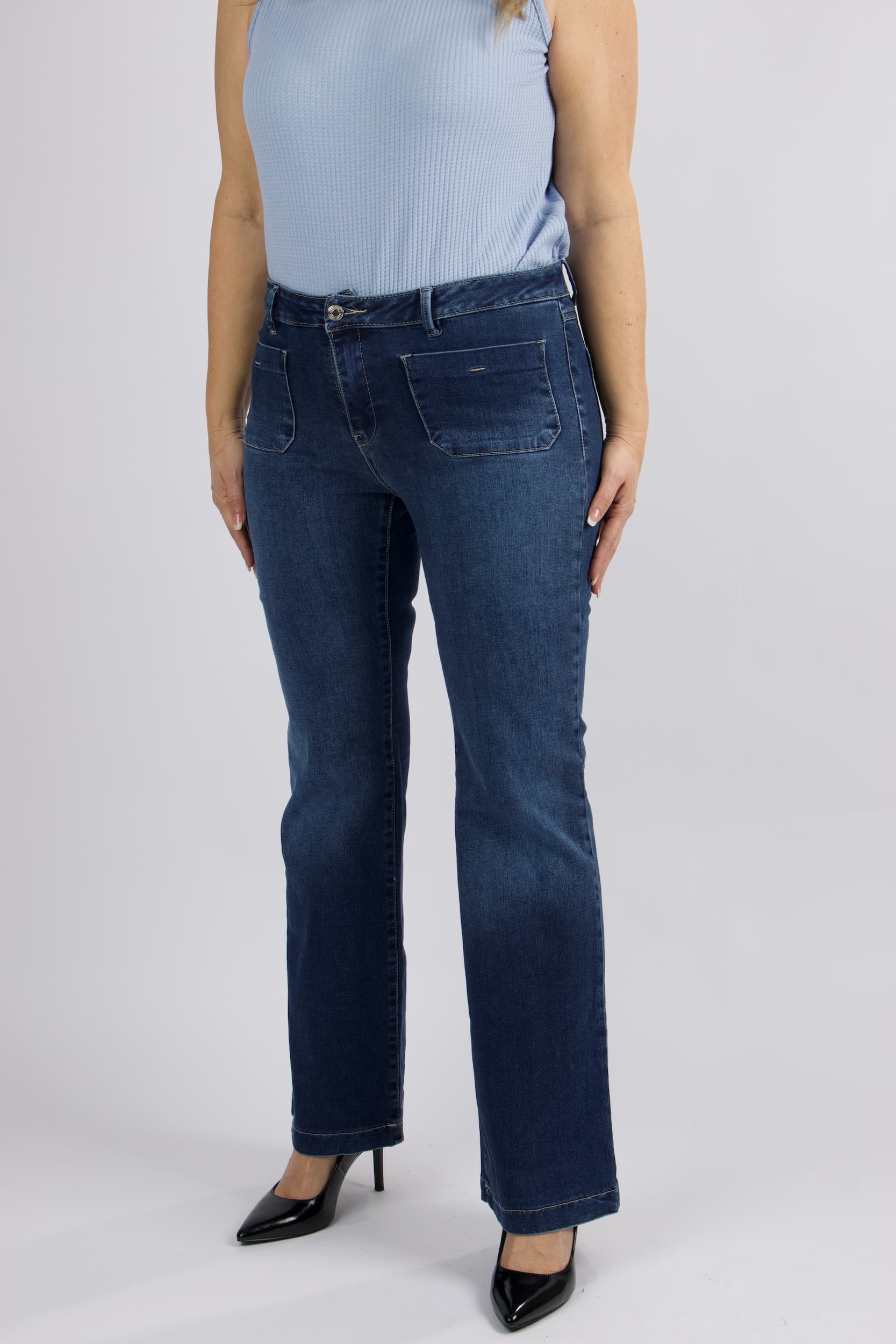 ג'ינס בגזרת פלייר עדינה בגוון כחול קלאסי . המכנסיים מתאפיינים בקו מותן מודגש הכולל חגורה תואמת, סגירת רוכסן וכפתור, וארבעה כיסים – זוג כיסים קדמיים במראה מעוגל וכיסים אחוריים להשלמת הלוק.