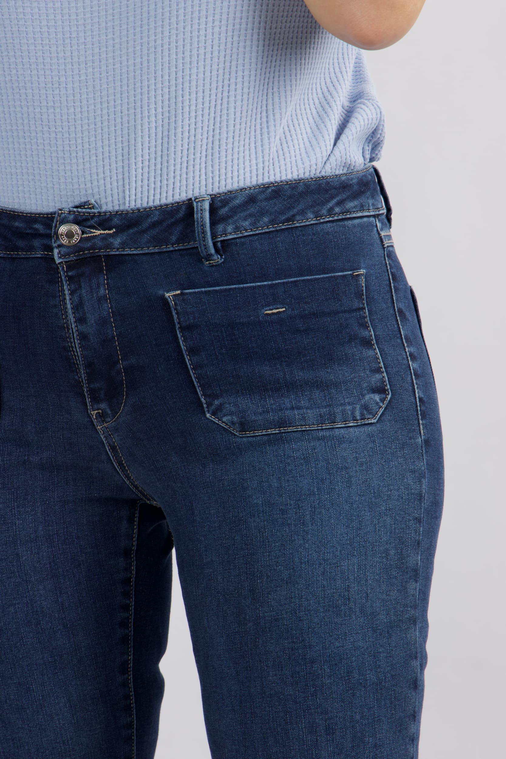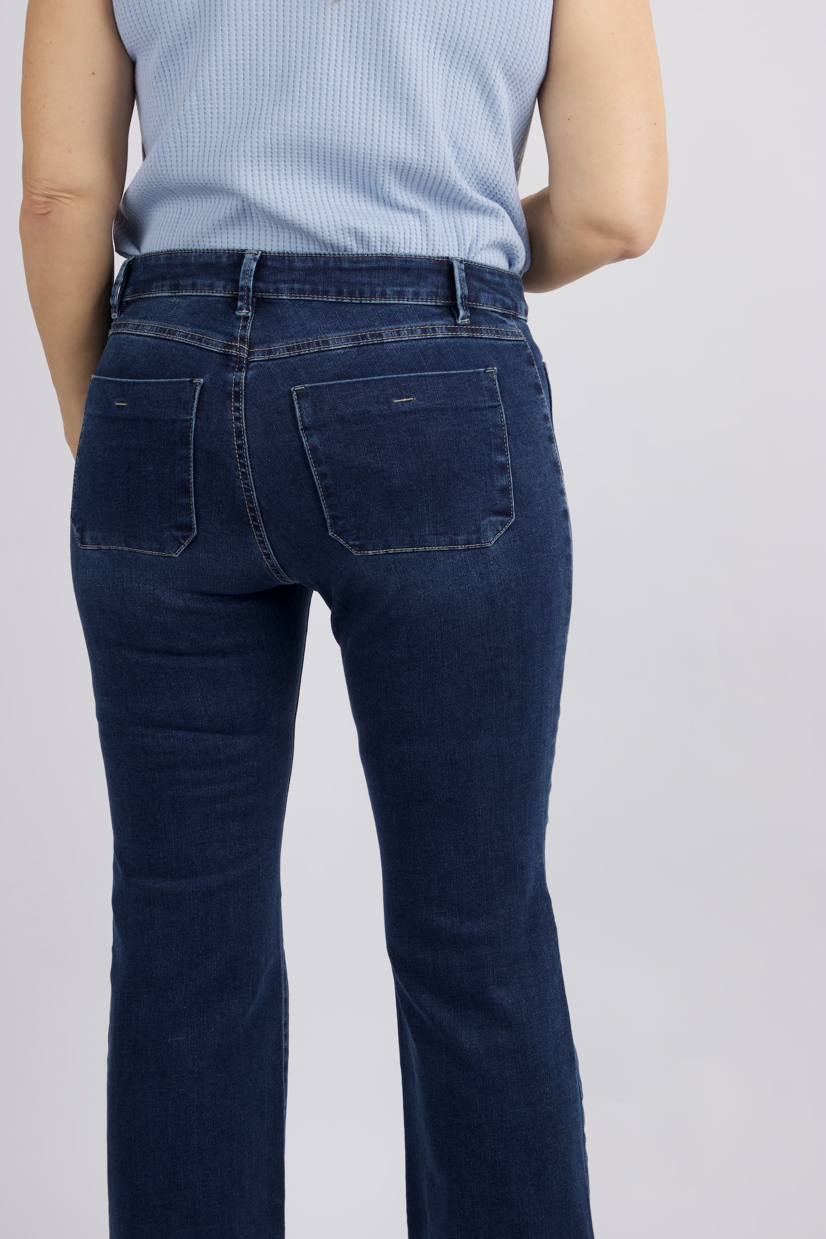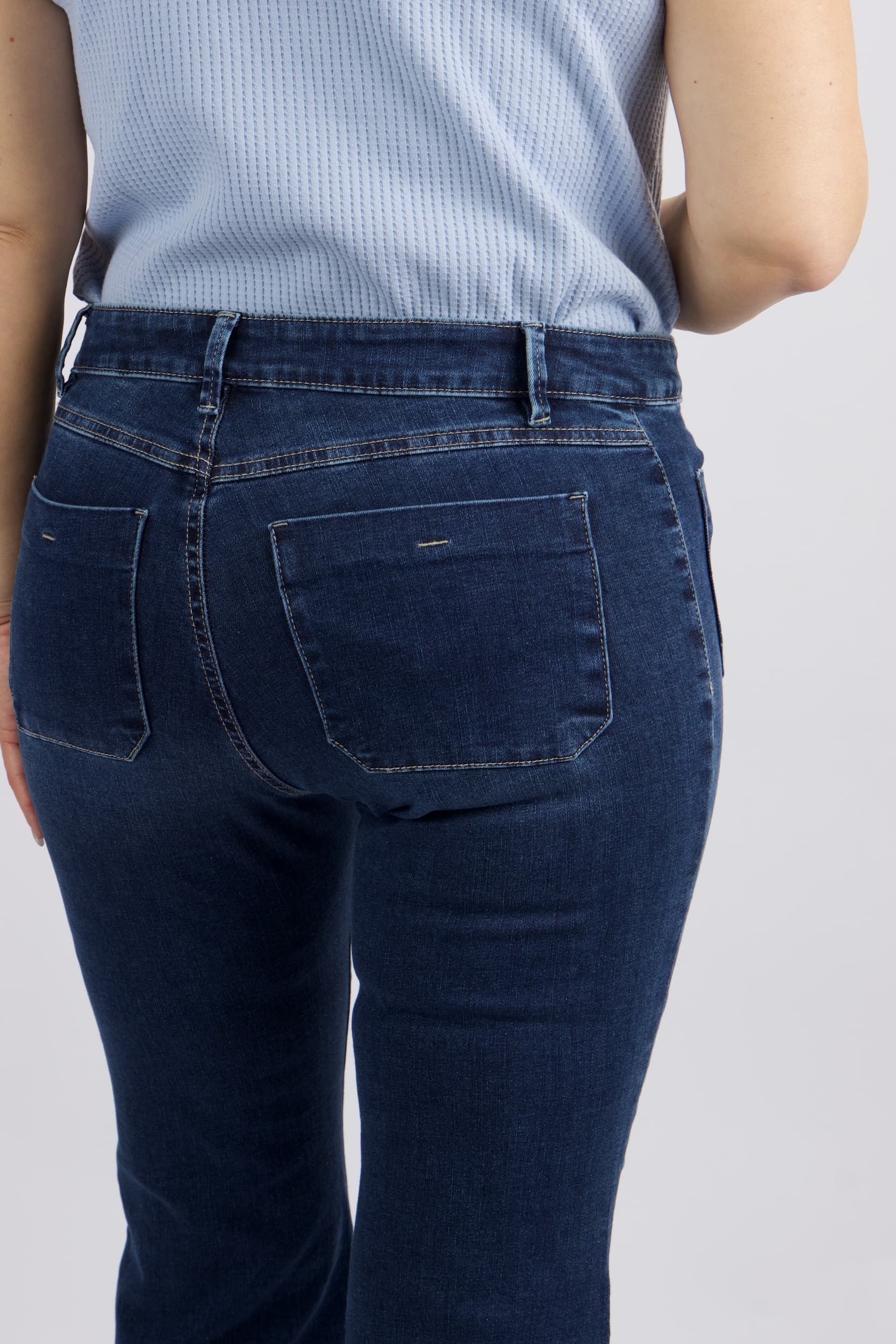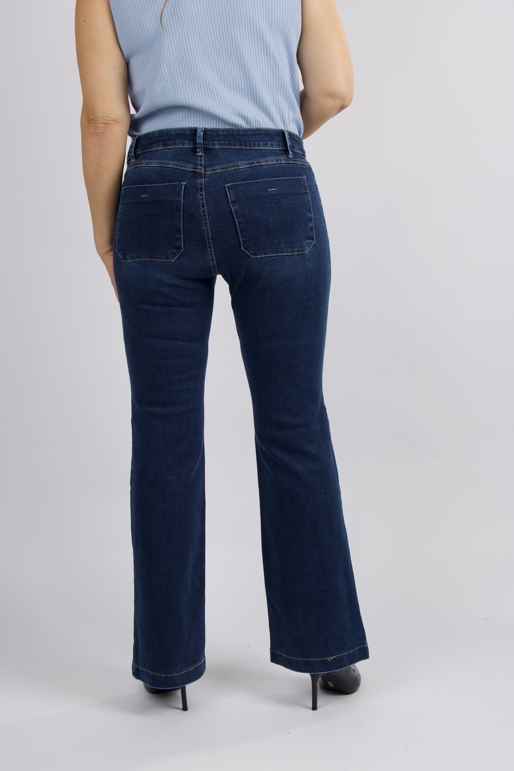 ג'ינס בגזרת פלייר עדינה בגוון כחול קלאסי . המכנסיים מתאפיינים בקו מותן מודגש הכולל חגורה תואמת, סגירת רוכסן וכפתור, וארבעה כיסים – זוג כיסים קדמיים במראה מעוגל וכיסים אחוריים להשלמת הלוק.