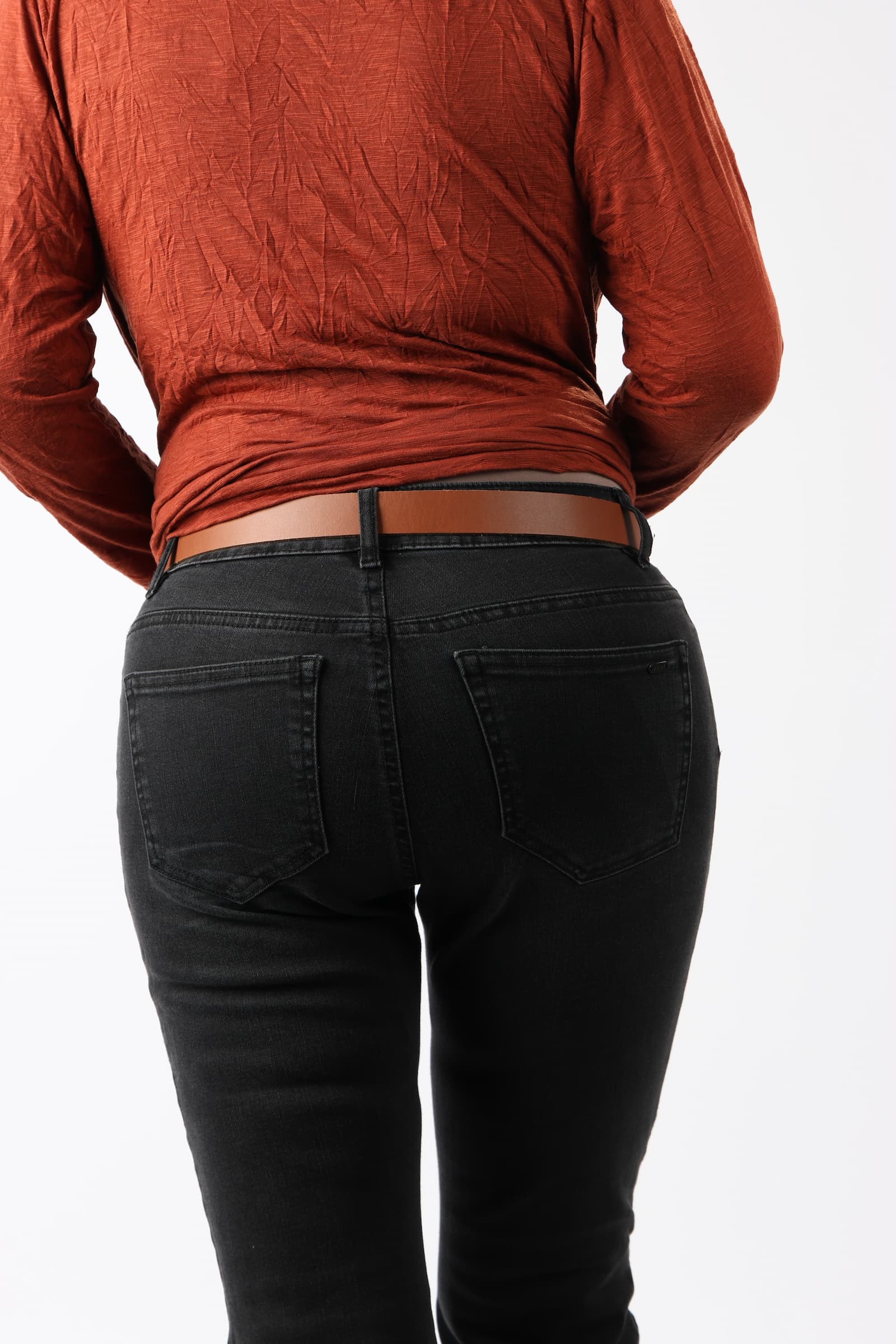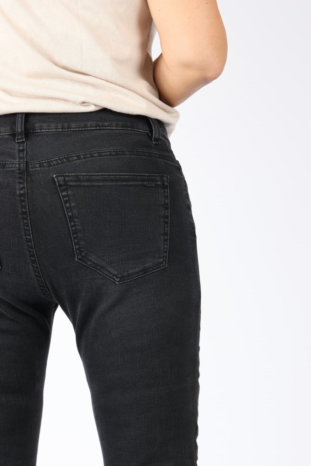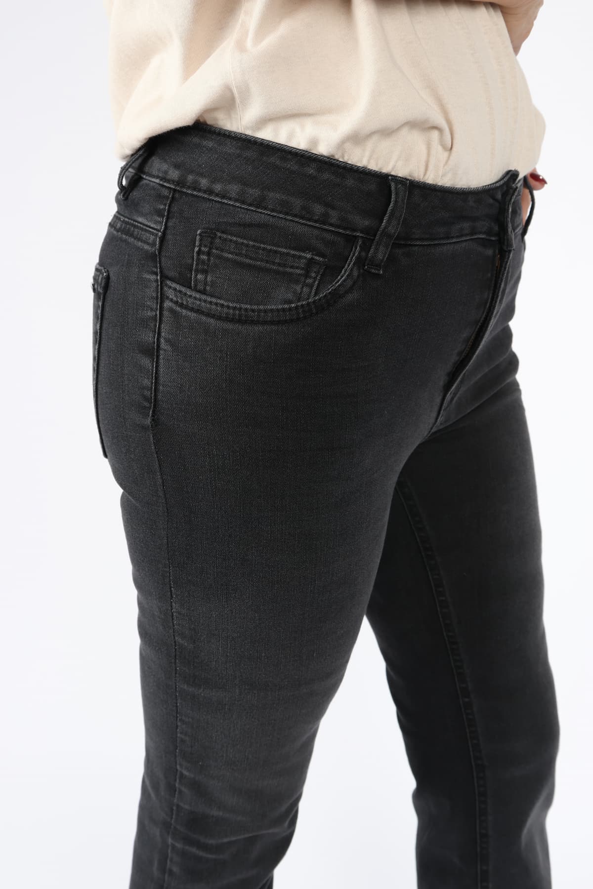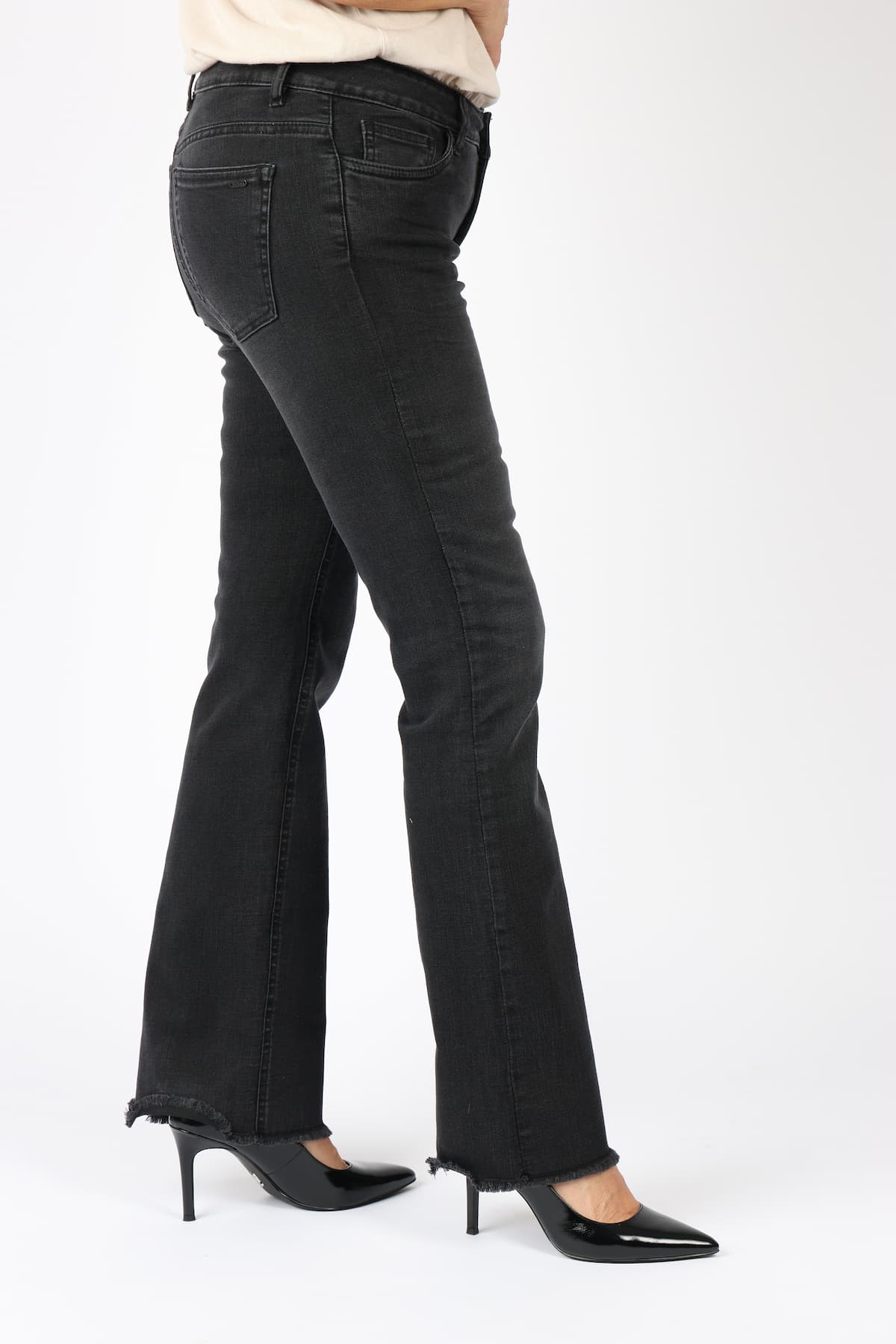 מכנסי ג'ינס שחורים בגזרה פלייר צמודים בפרימה עדינה בסיומת , רכיסת כפתור ורוכסן, כיסים קדמיים ואחוריים