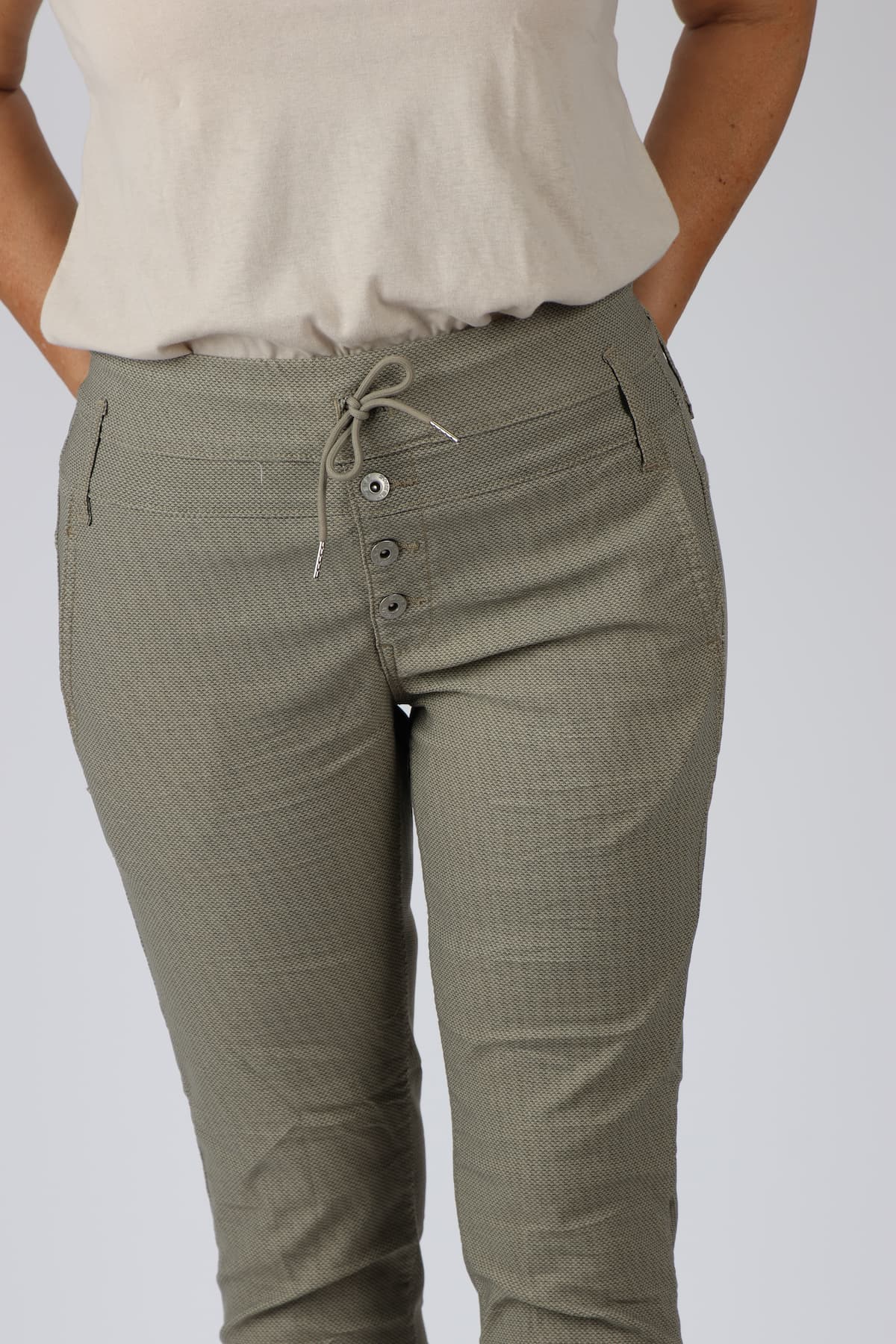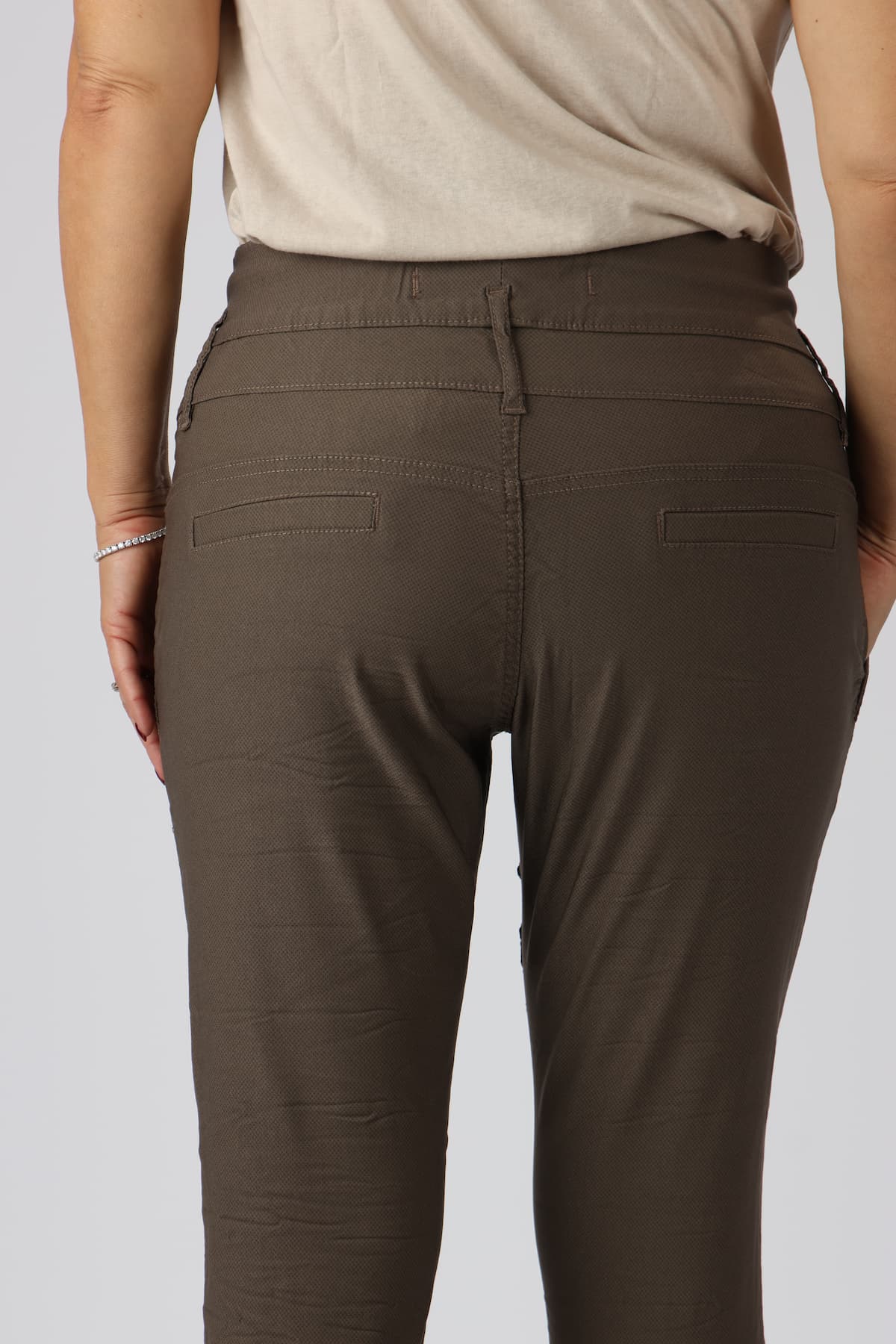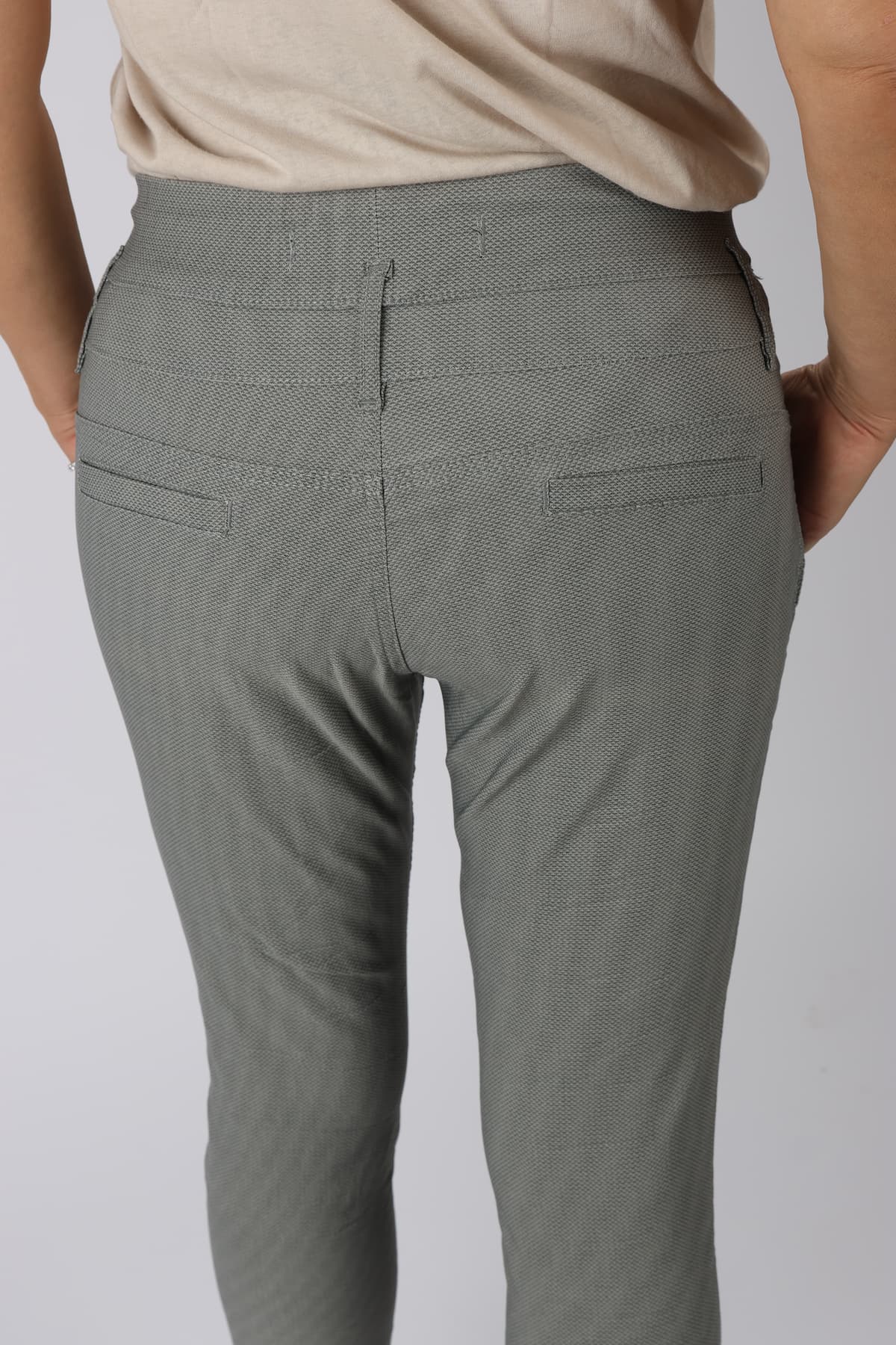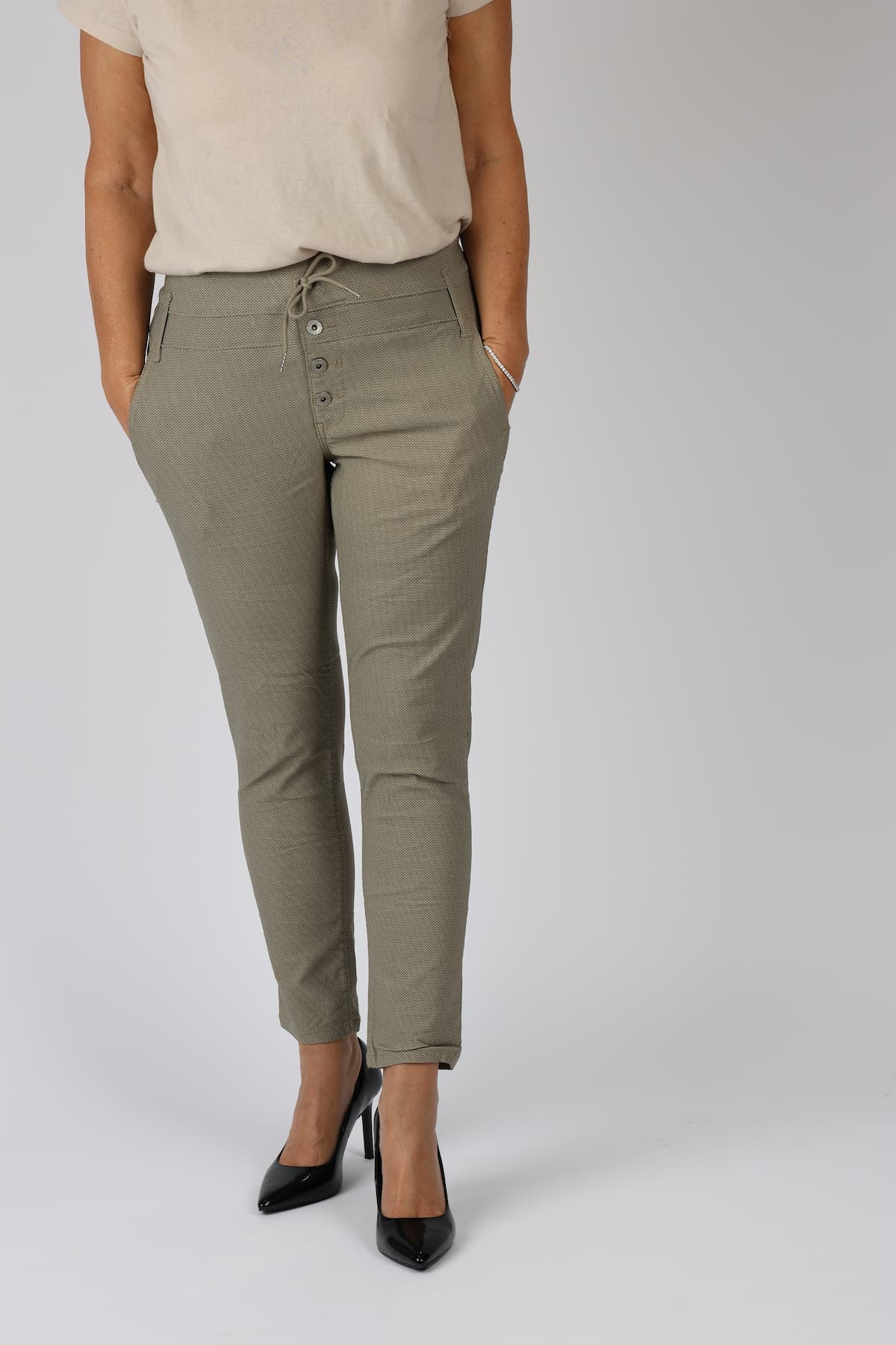 מכנסי כותנה בגזרת סקיני בשילוב חגורה רחבה במותן, רכיסת כפתורים, כיסים קדמיים ואחוריים