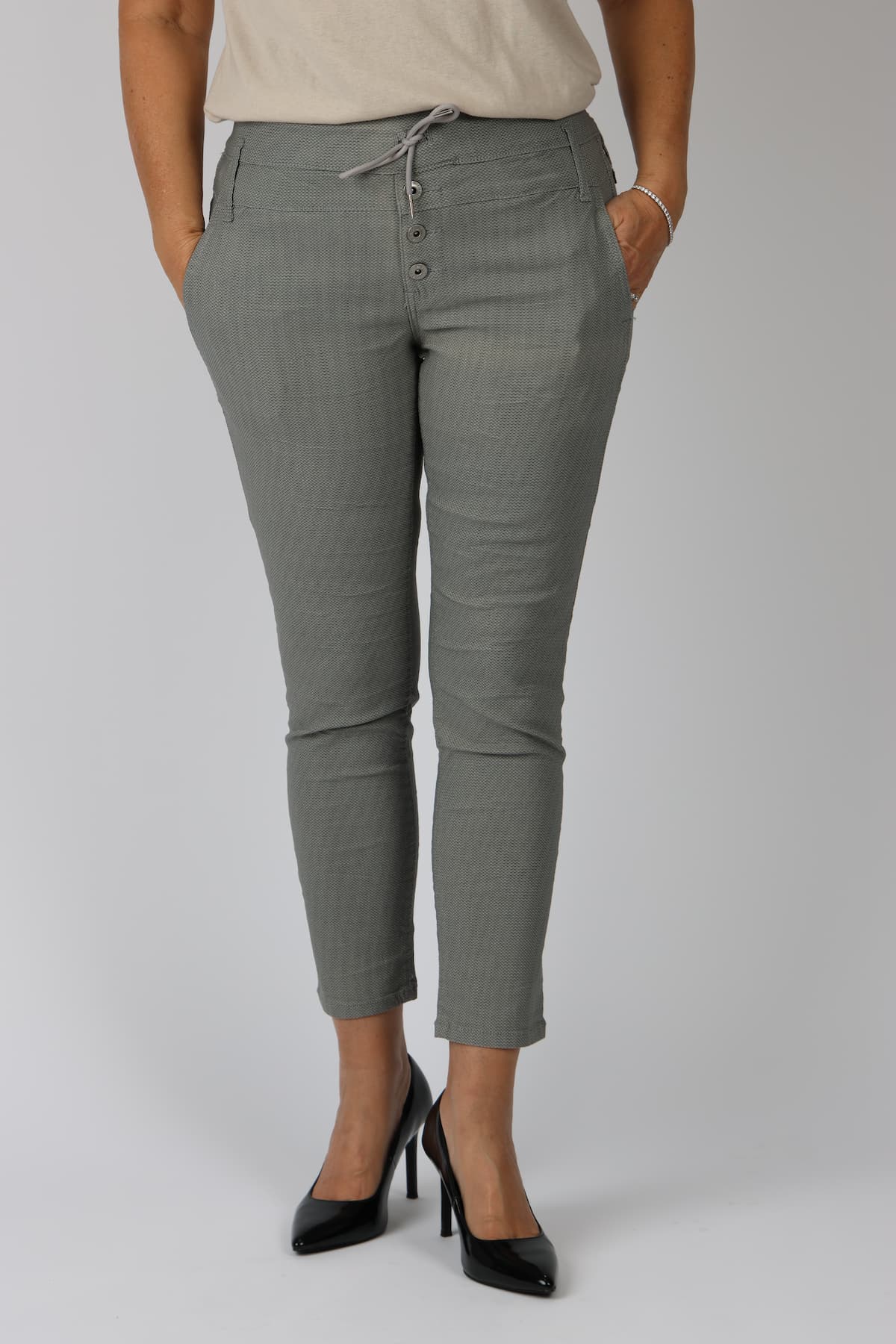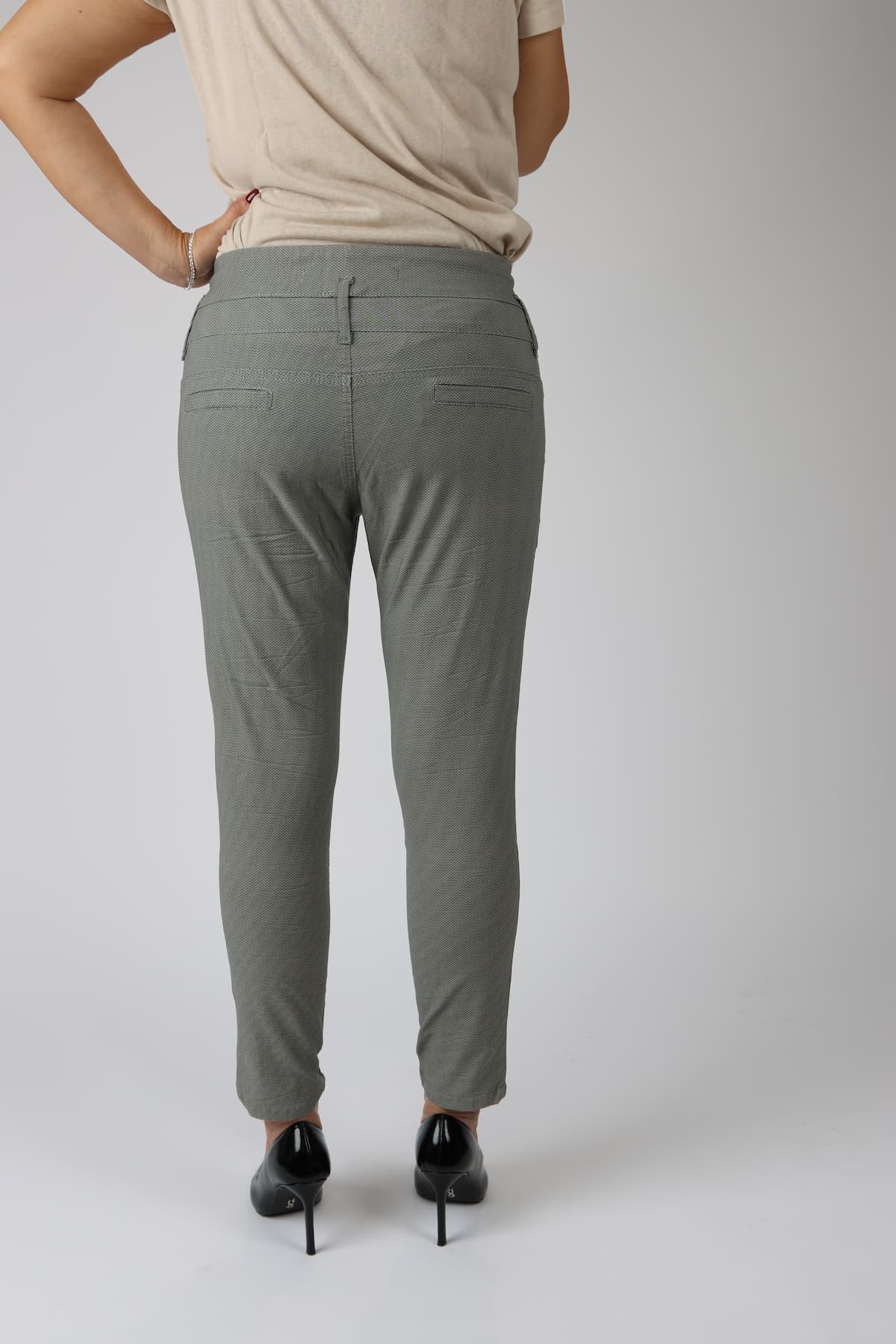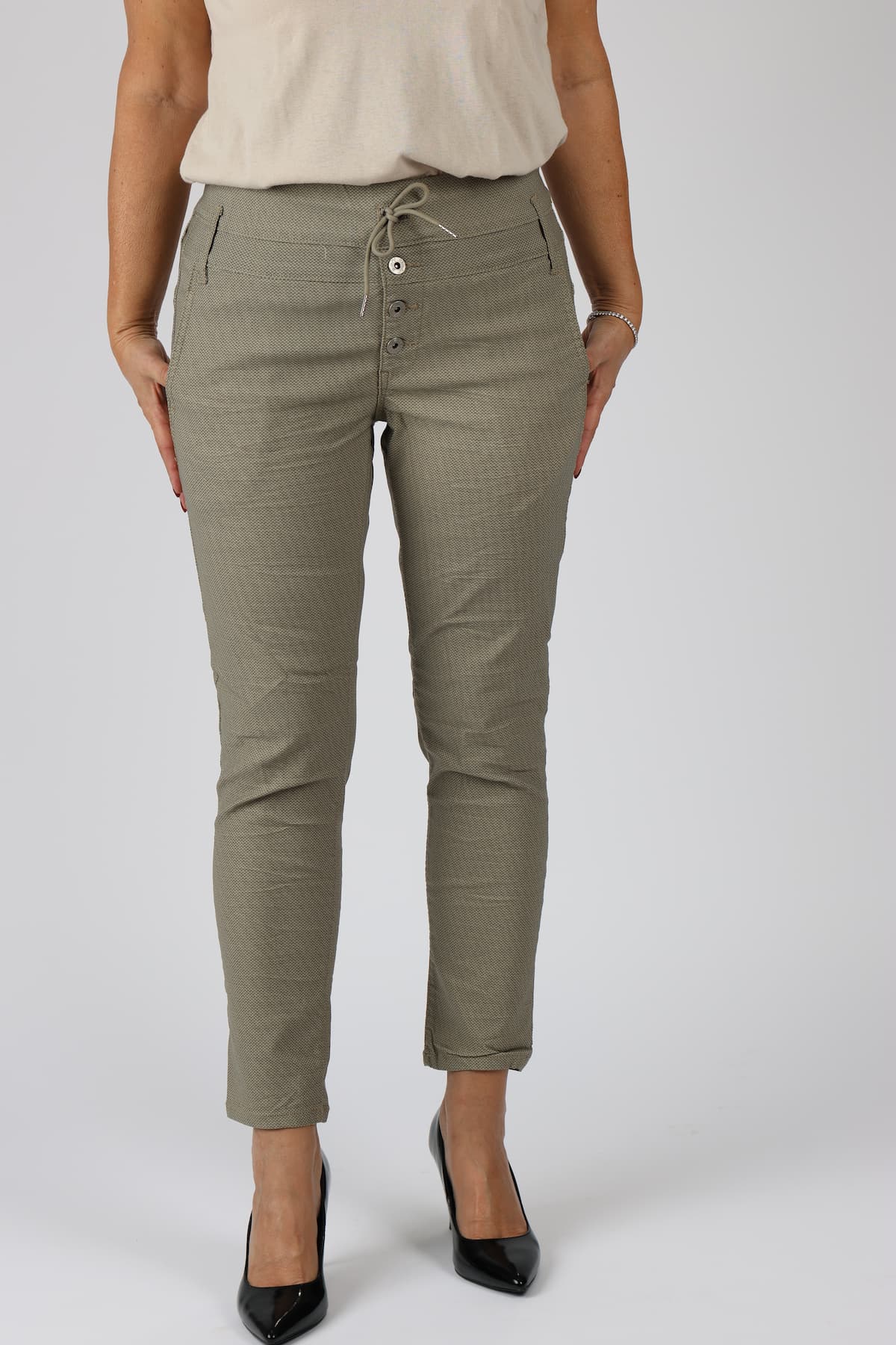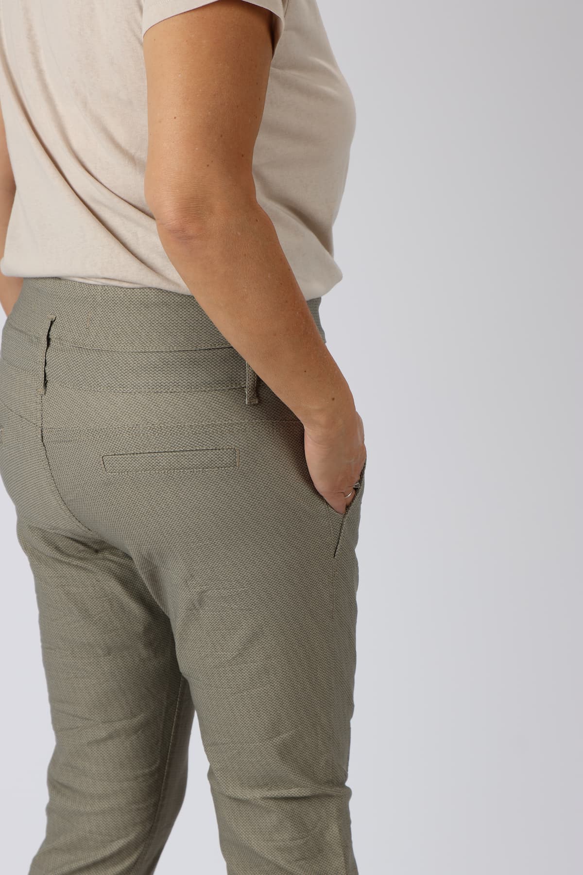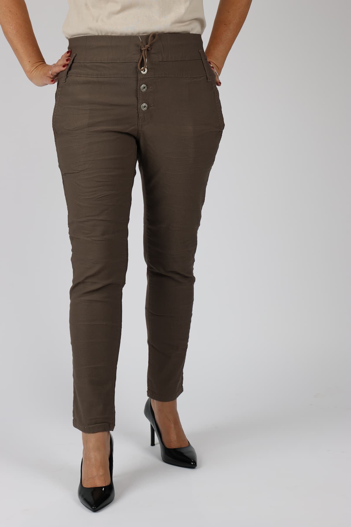 מכנסי כותנה בגזרת סקיני בשילוב חגורה רחבה במותן, רכיסת כפתורים, כיסים קדמיים ואחוריים