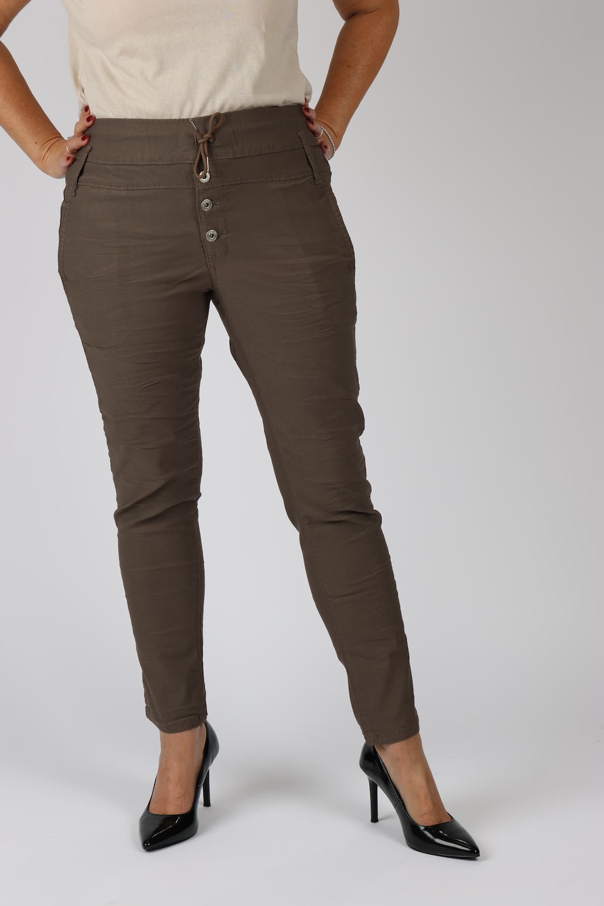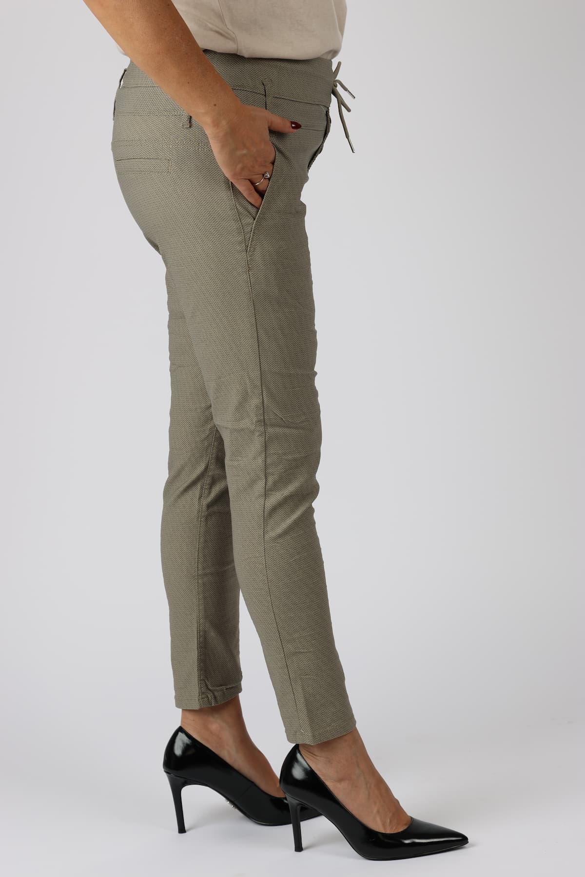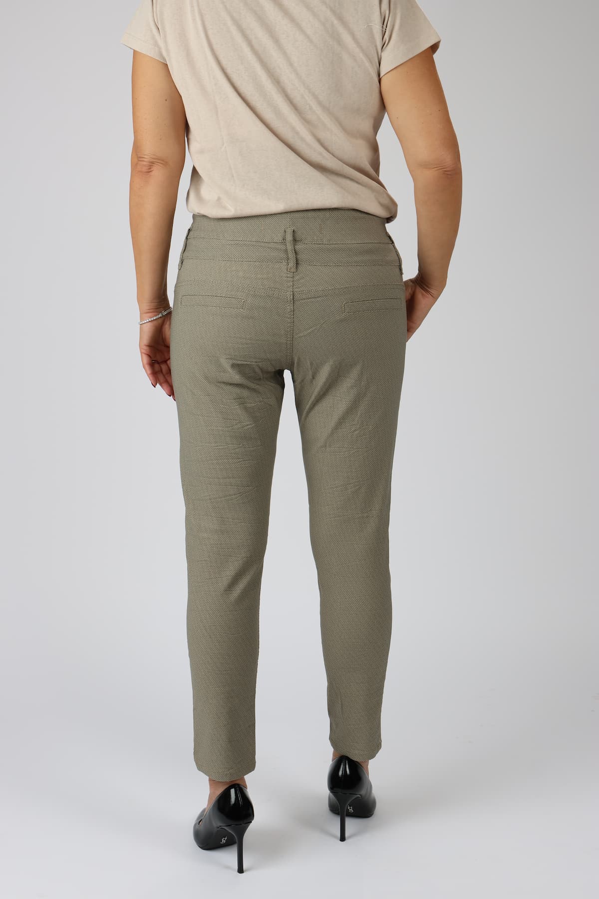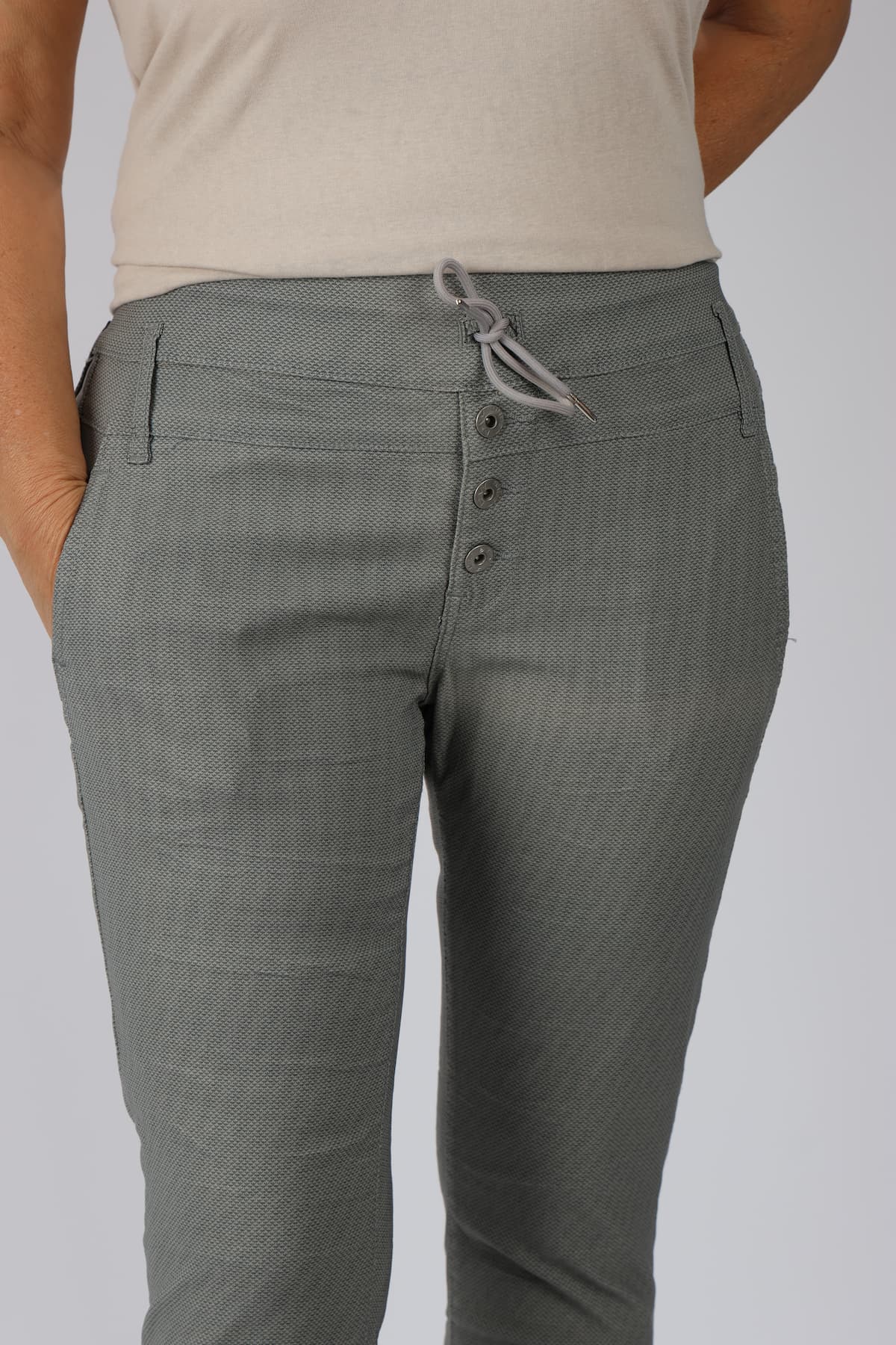 מכנסי כותנה בגזרת סקיני בשילוב חגורה רחבה במותן, רכיסת כפתורים, כיסים קדמיים ואחוריים