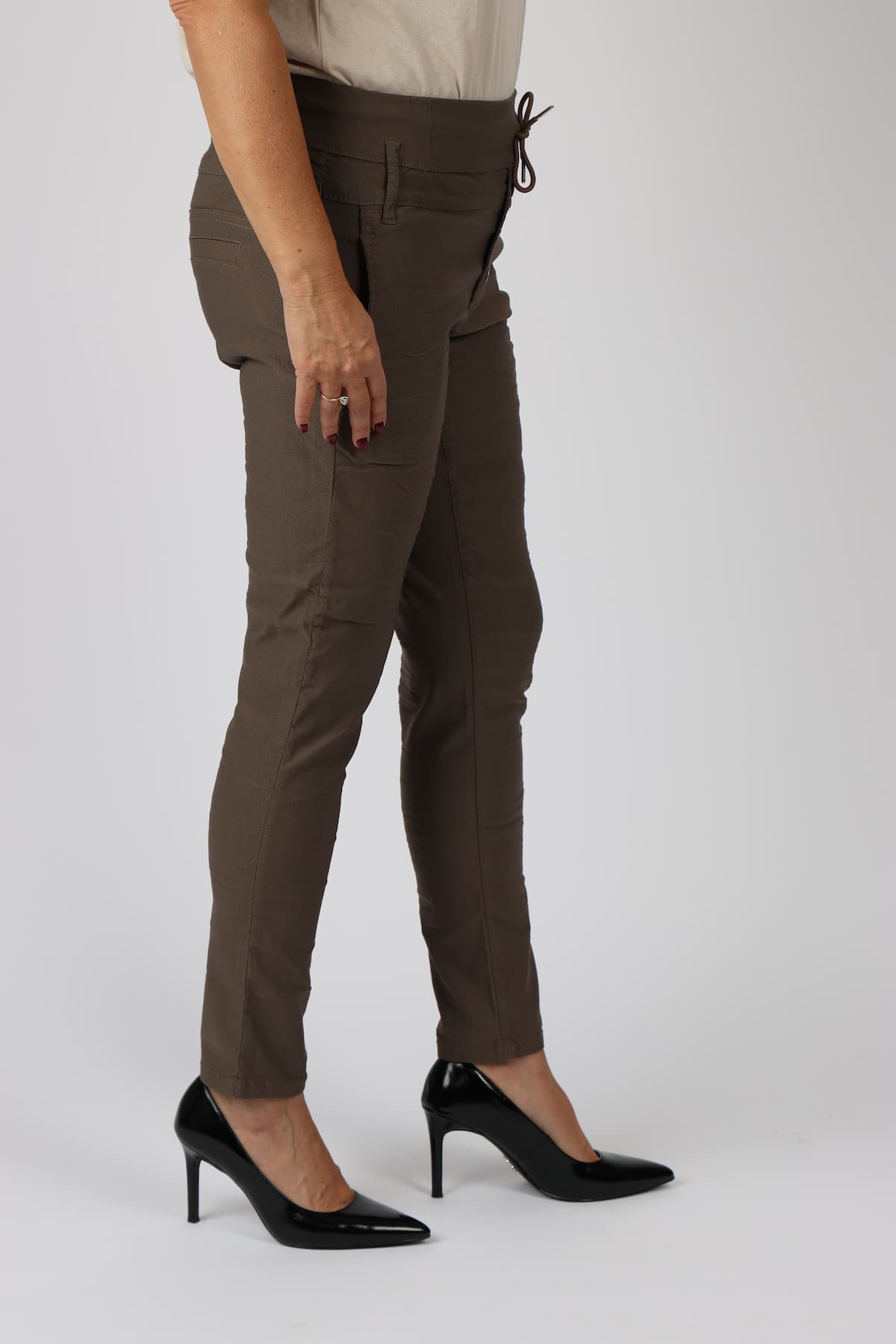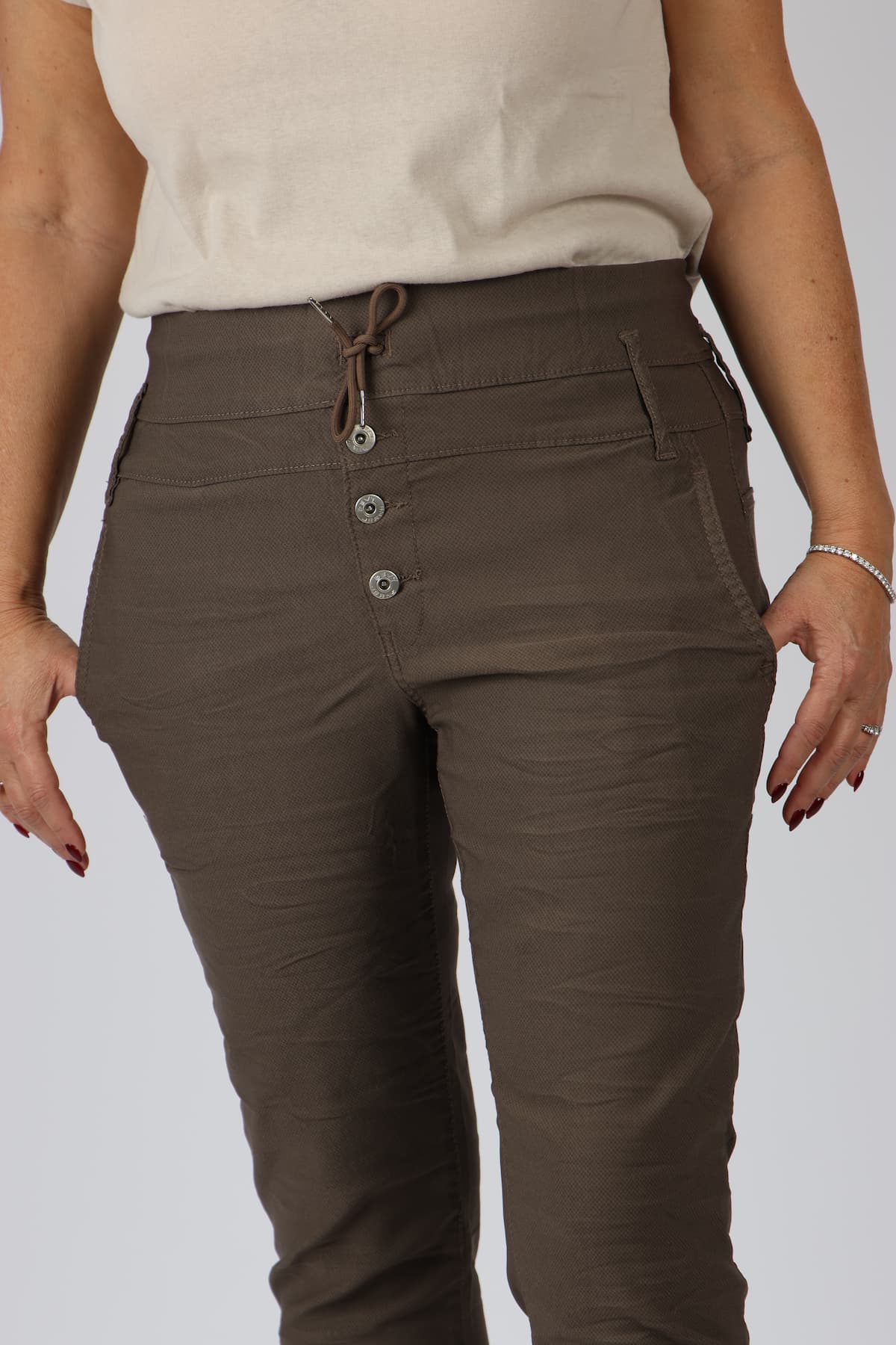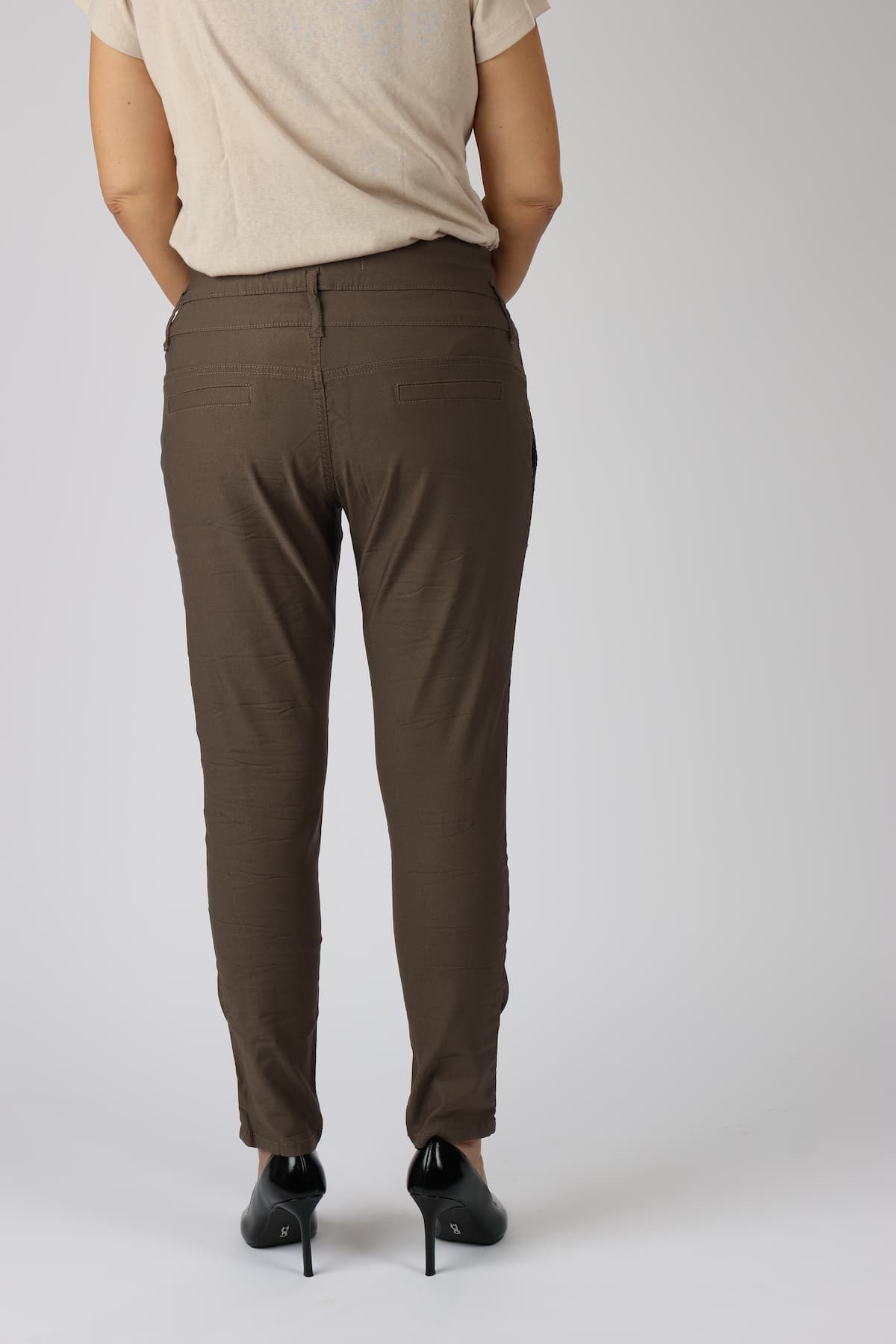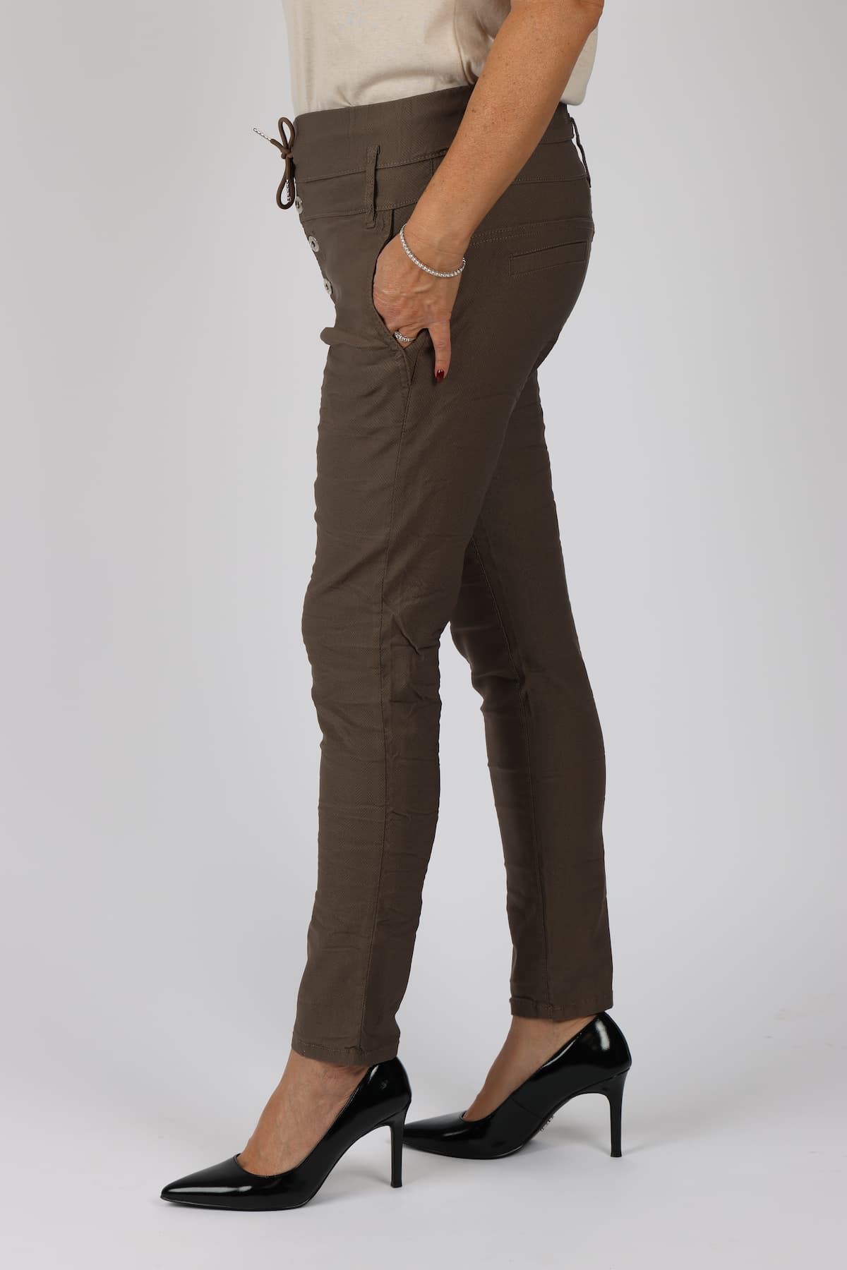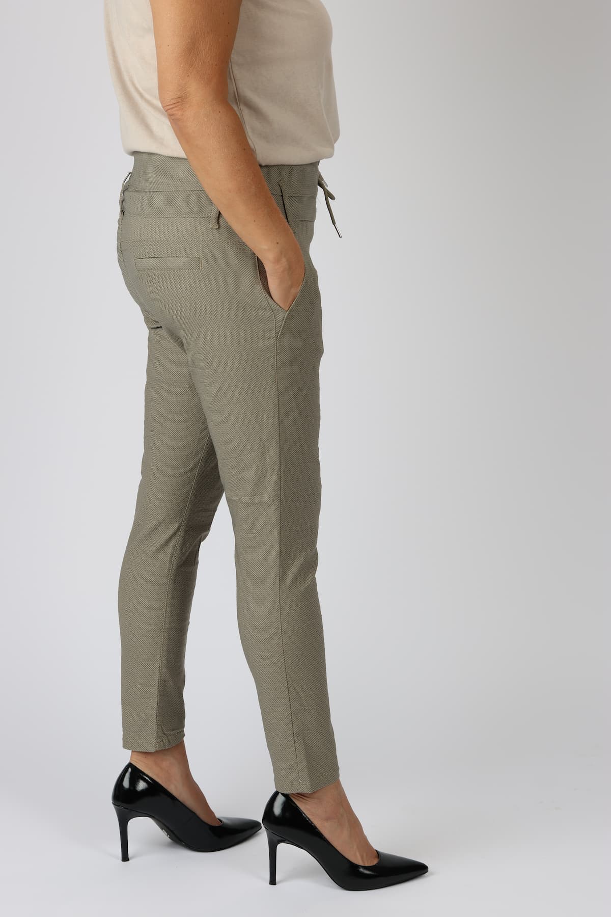 מכנסי כותנה בגזרת סקיני בשילוב חגורה רחבה במותן, רכיסת כפתורים, כיסים קדמיים ואחוריים