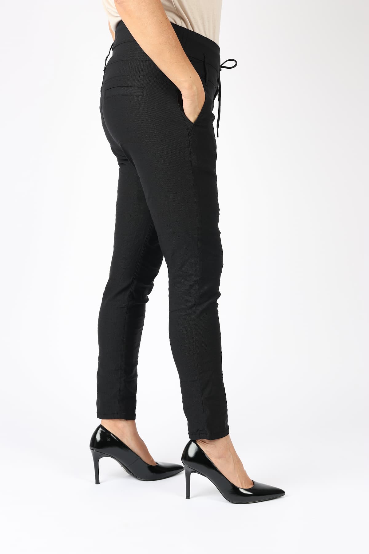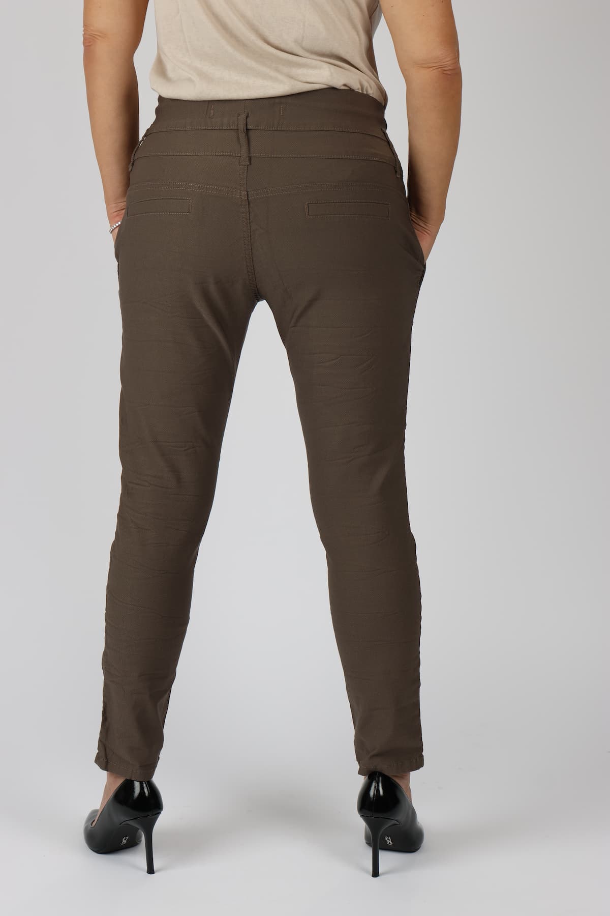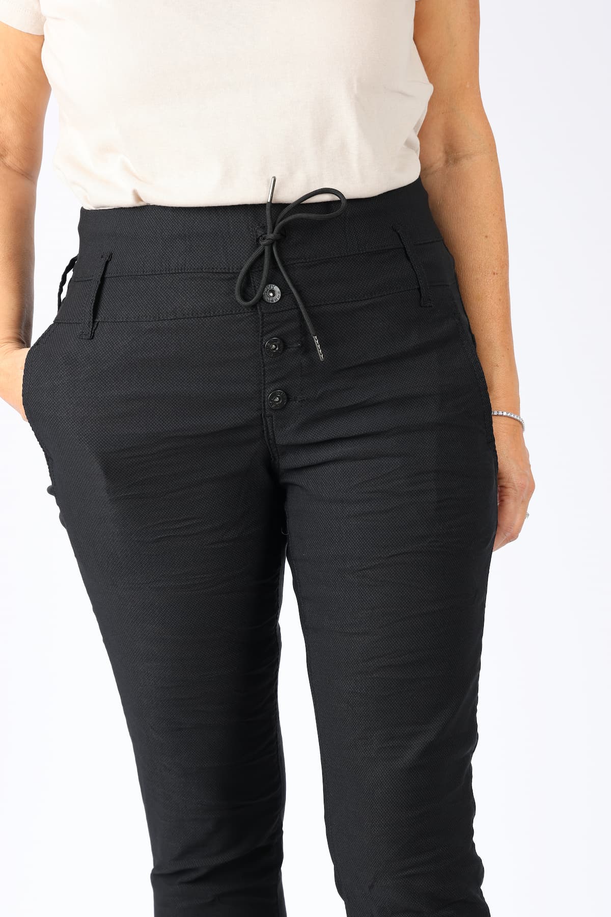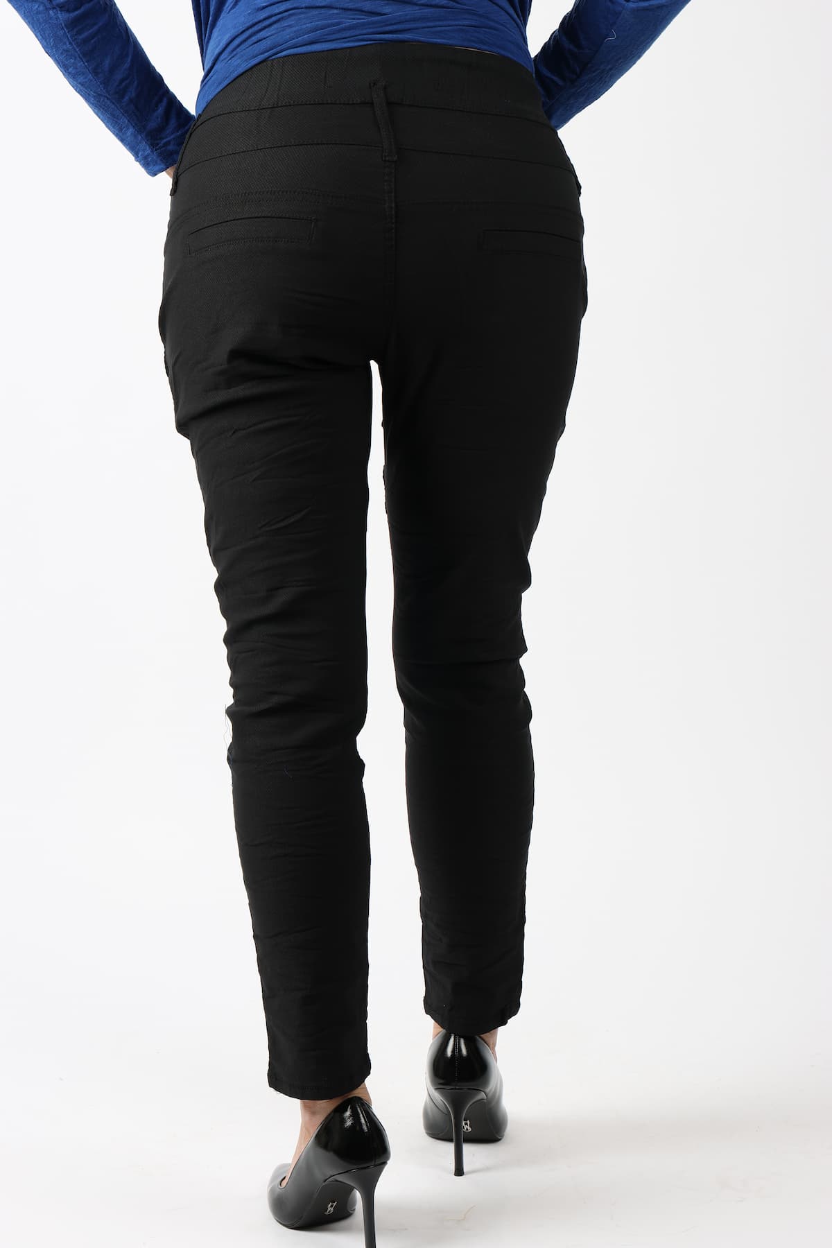 מכנסי כותנה בגזרת סקיני בשילוב חגורה רחבה במותן, רכיסת כפתורים, כיסים קדמיים ואחוריים