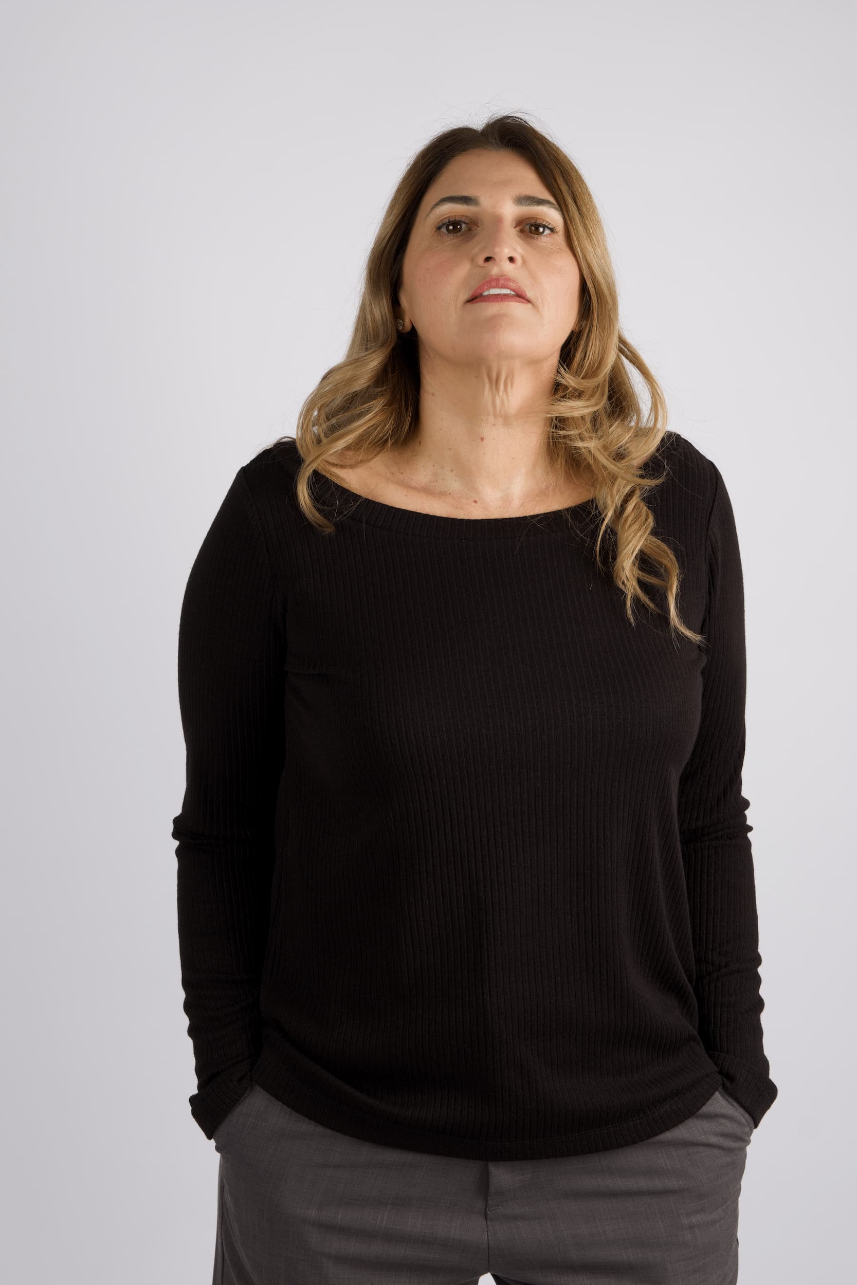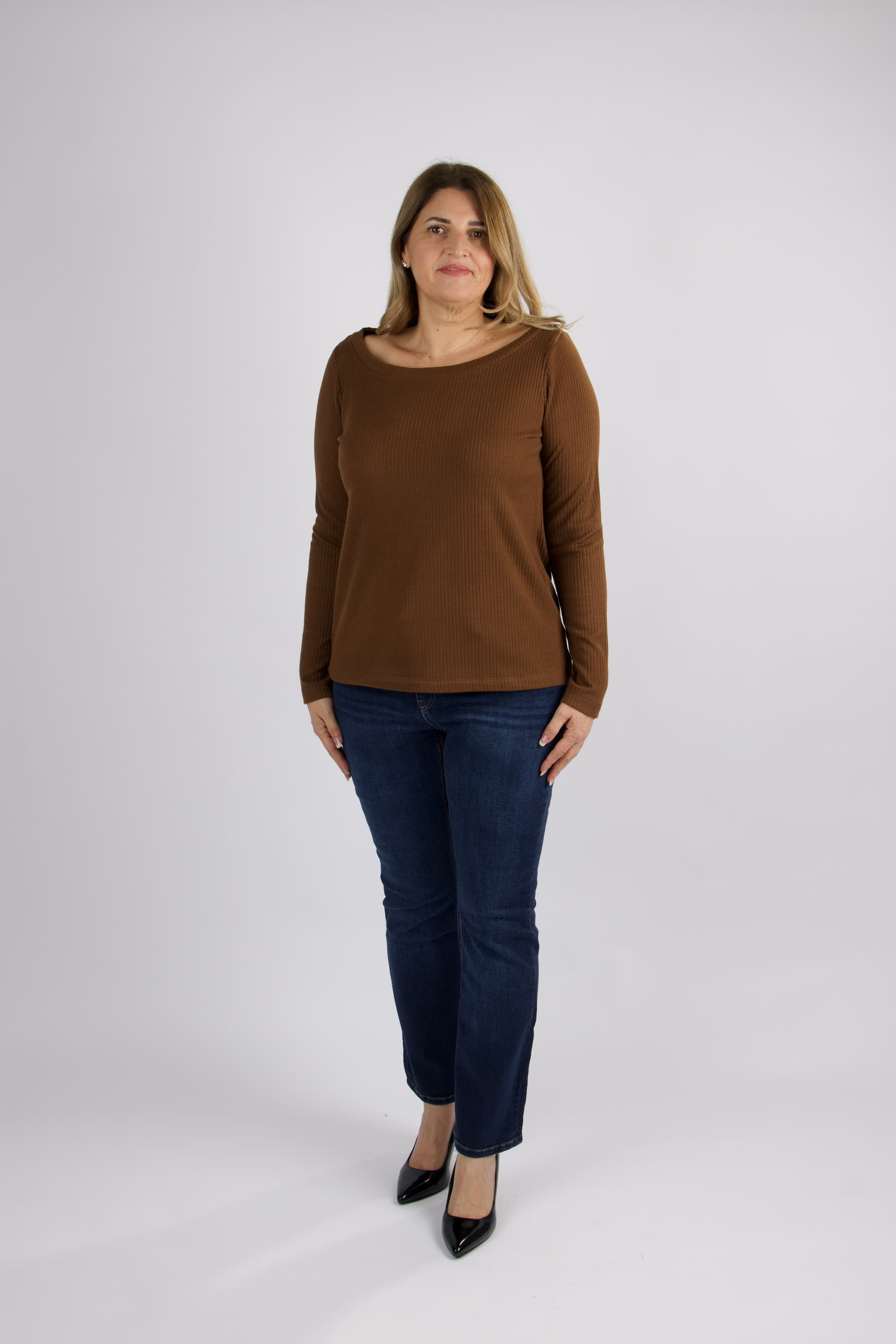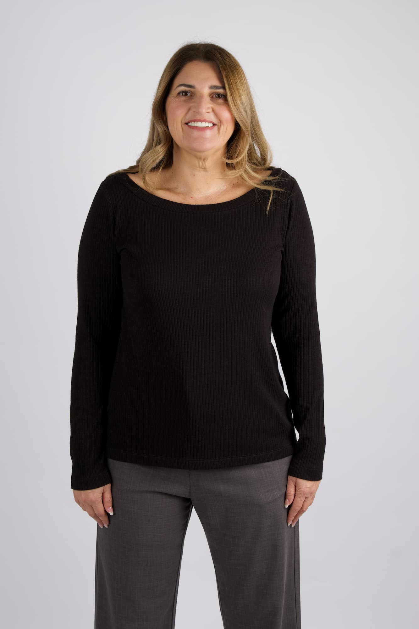 חולצת סירה קלאסית ומתוחכמת בעיצוב נקי ומינימליסטי. פתח הסירה המחמיא מדגיש את קו הכתפיים ומעניק מראה אלגנטי ונשי שמתאים לכל אירוע - מהמשרד ועד לערב בחוץ.