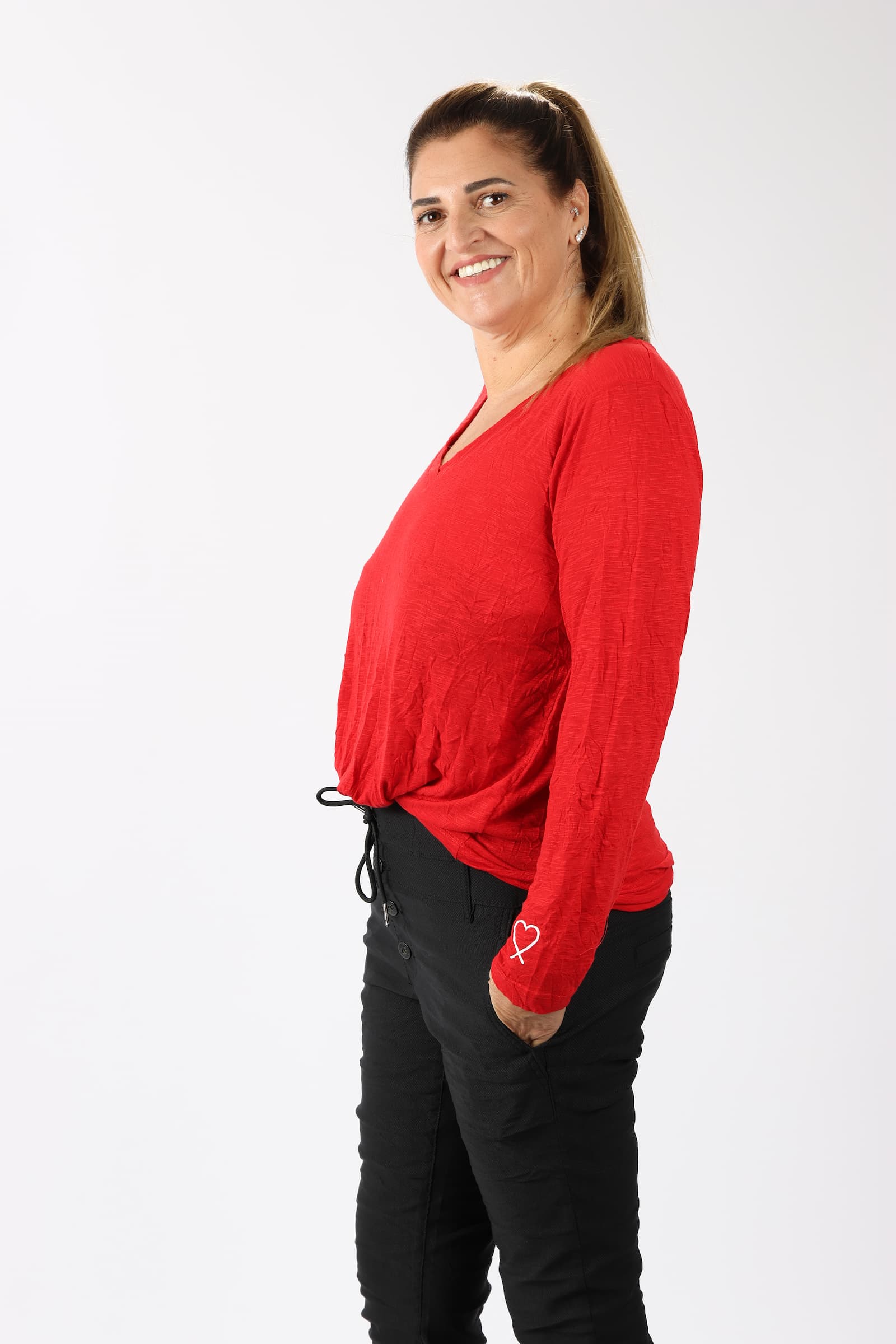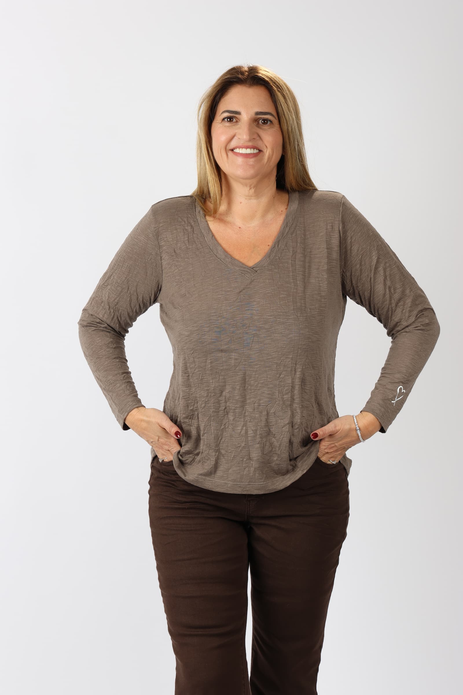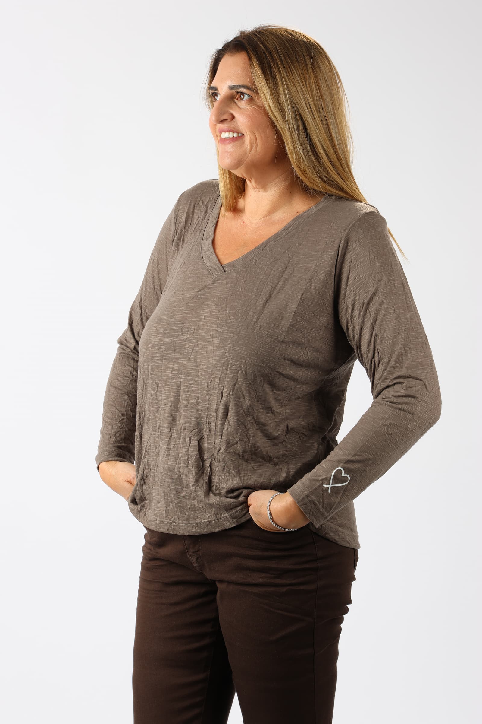 חולצה וי מבד מקומט עם הדפס לב בשרוול