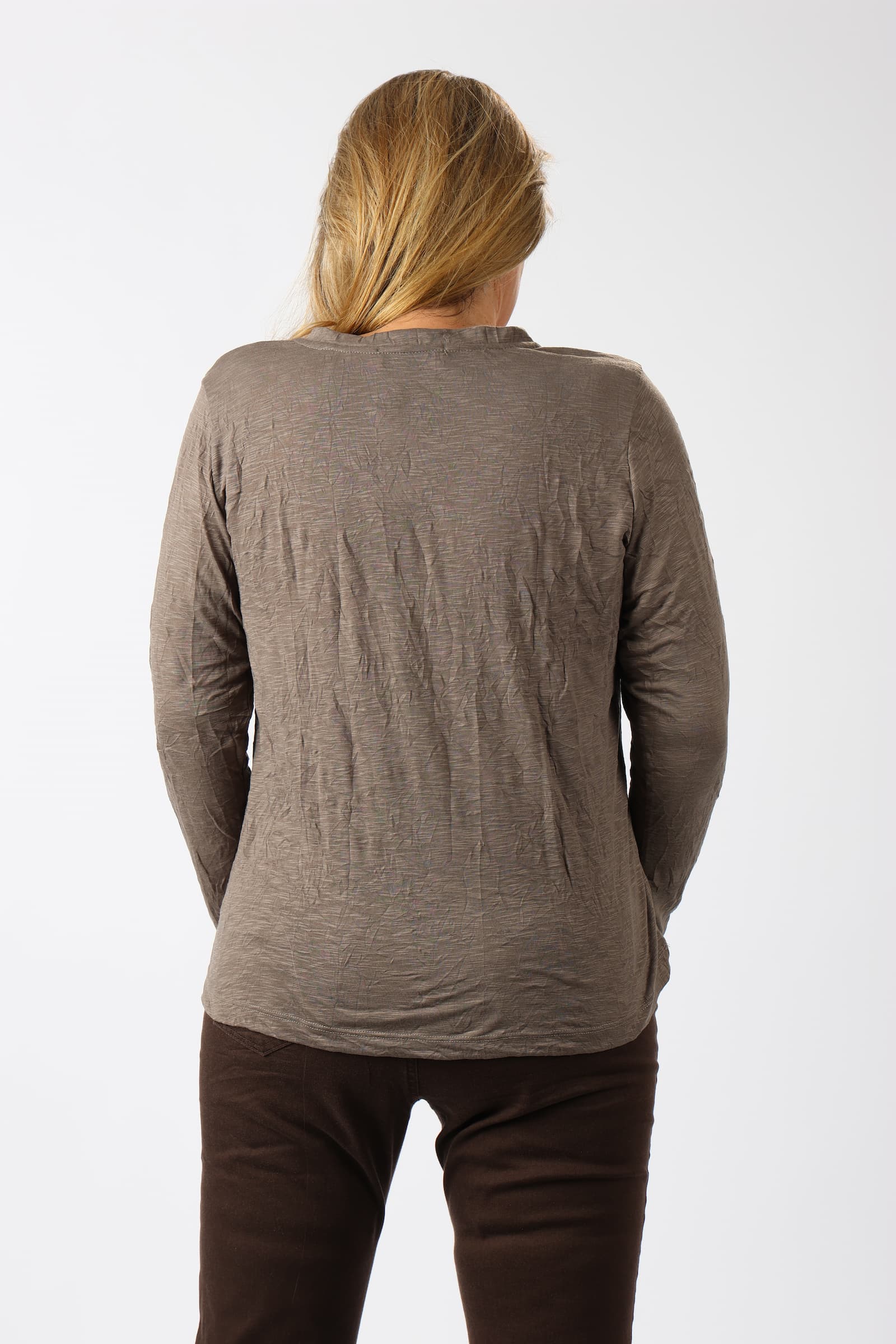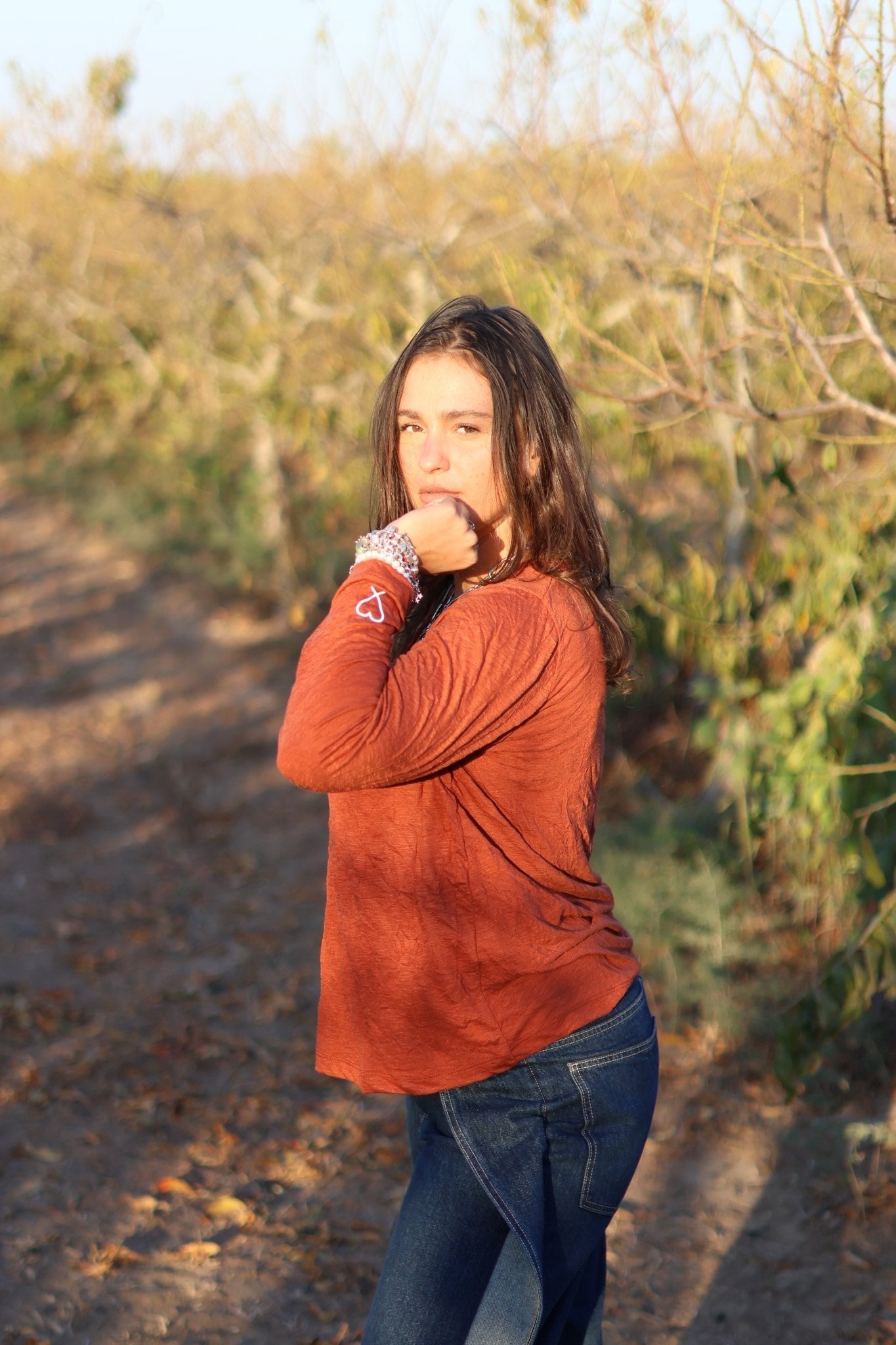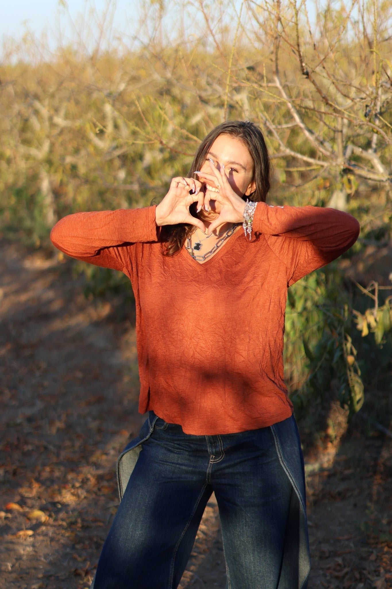 חולצה וי מבד מקומט עם הדפס לב בשרוול