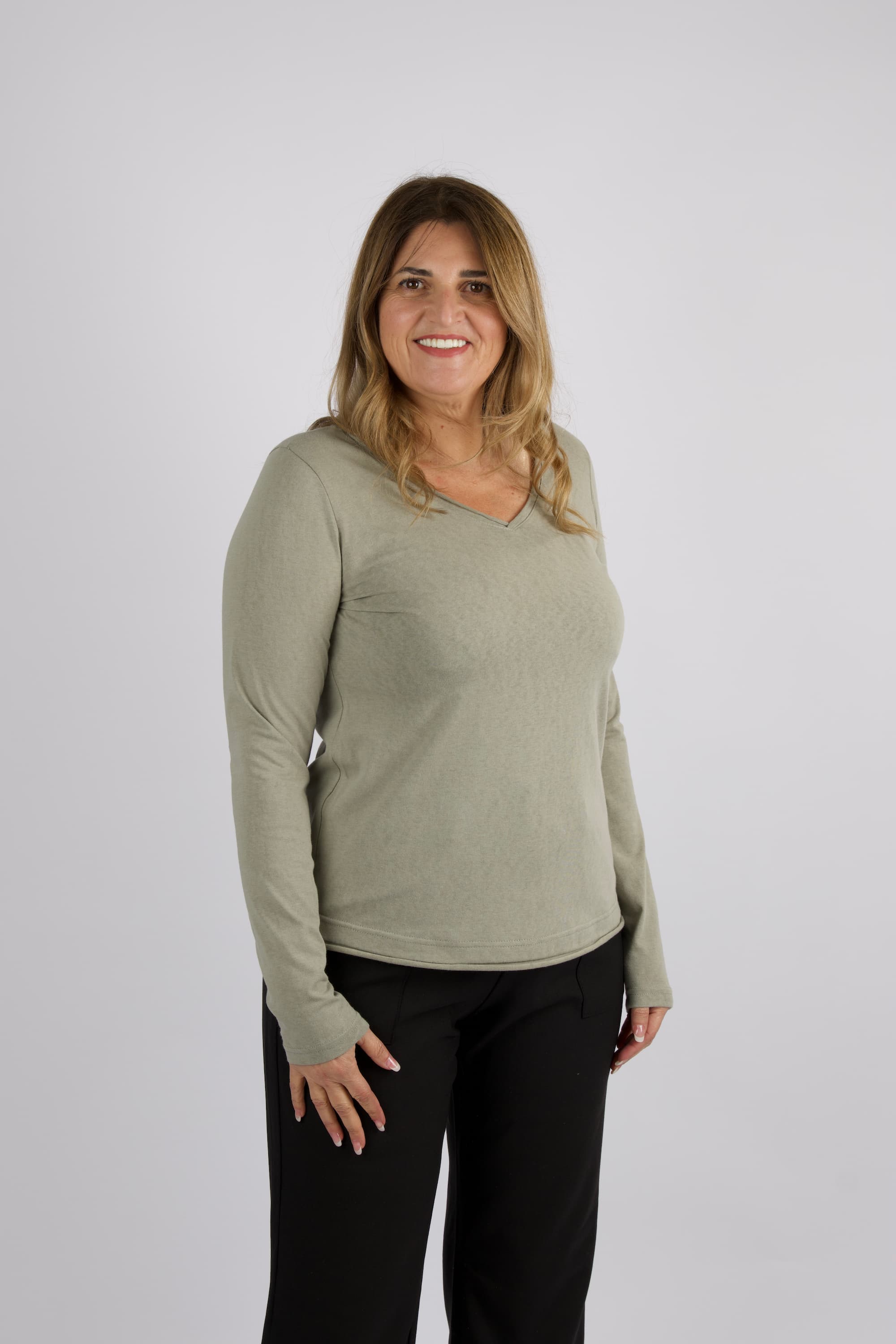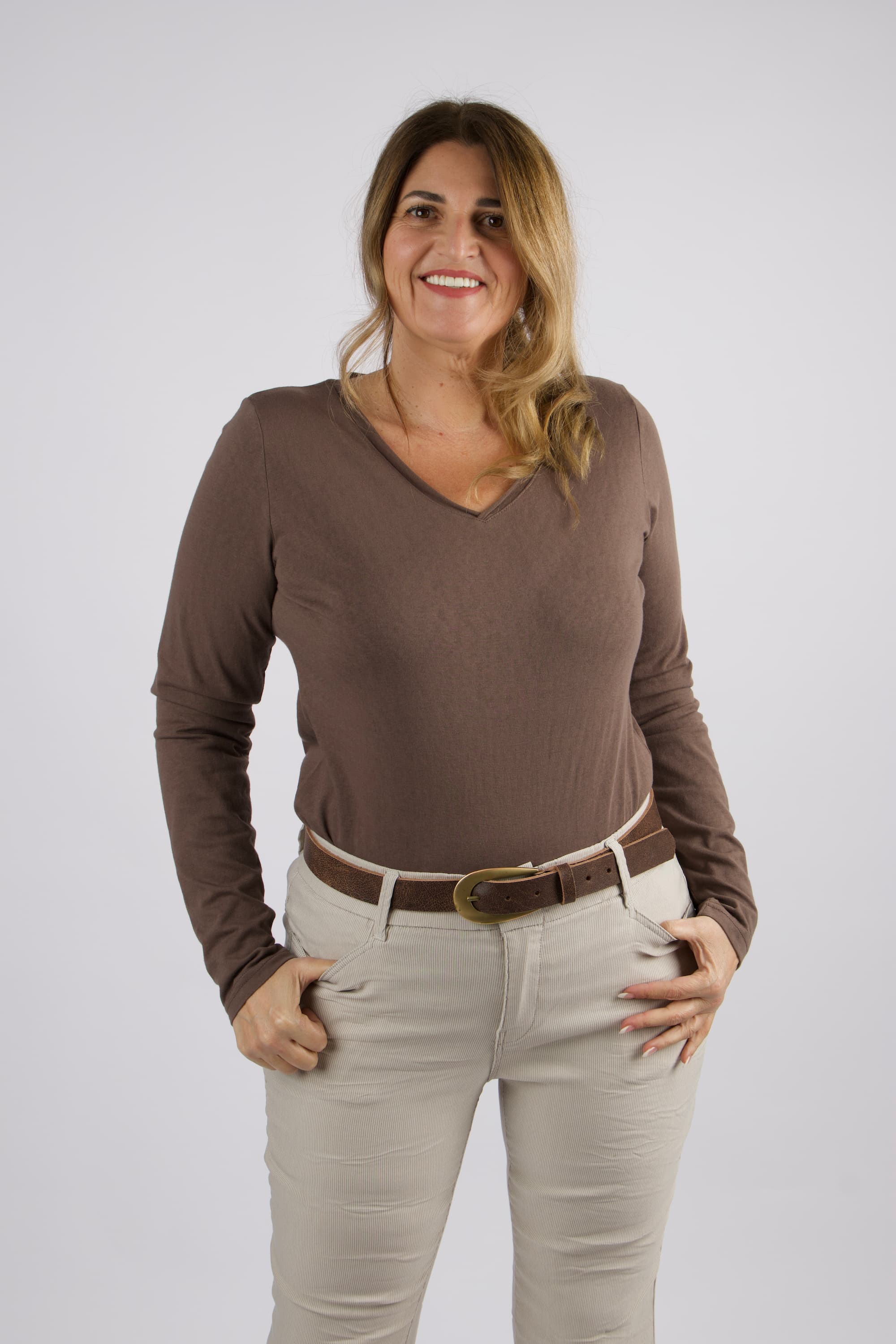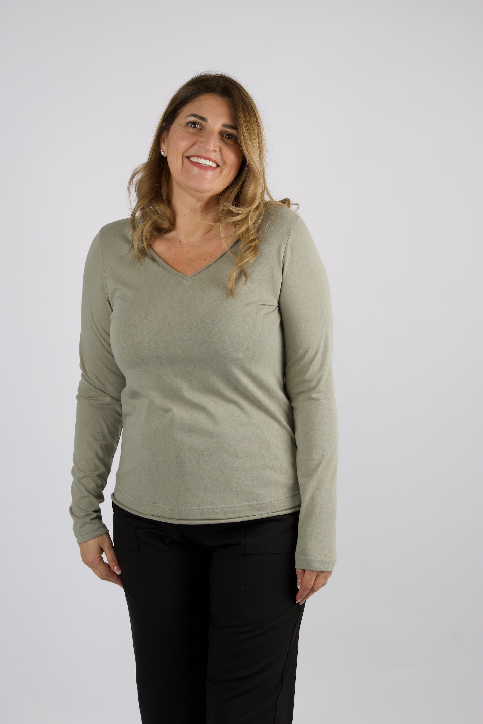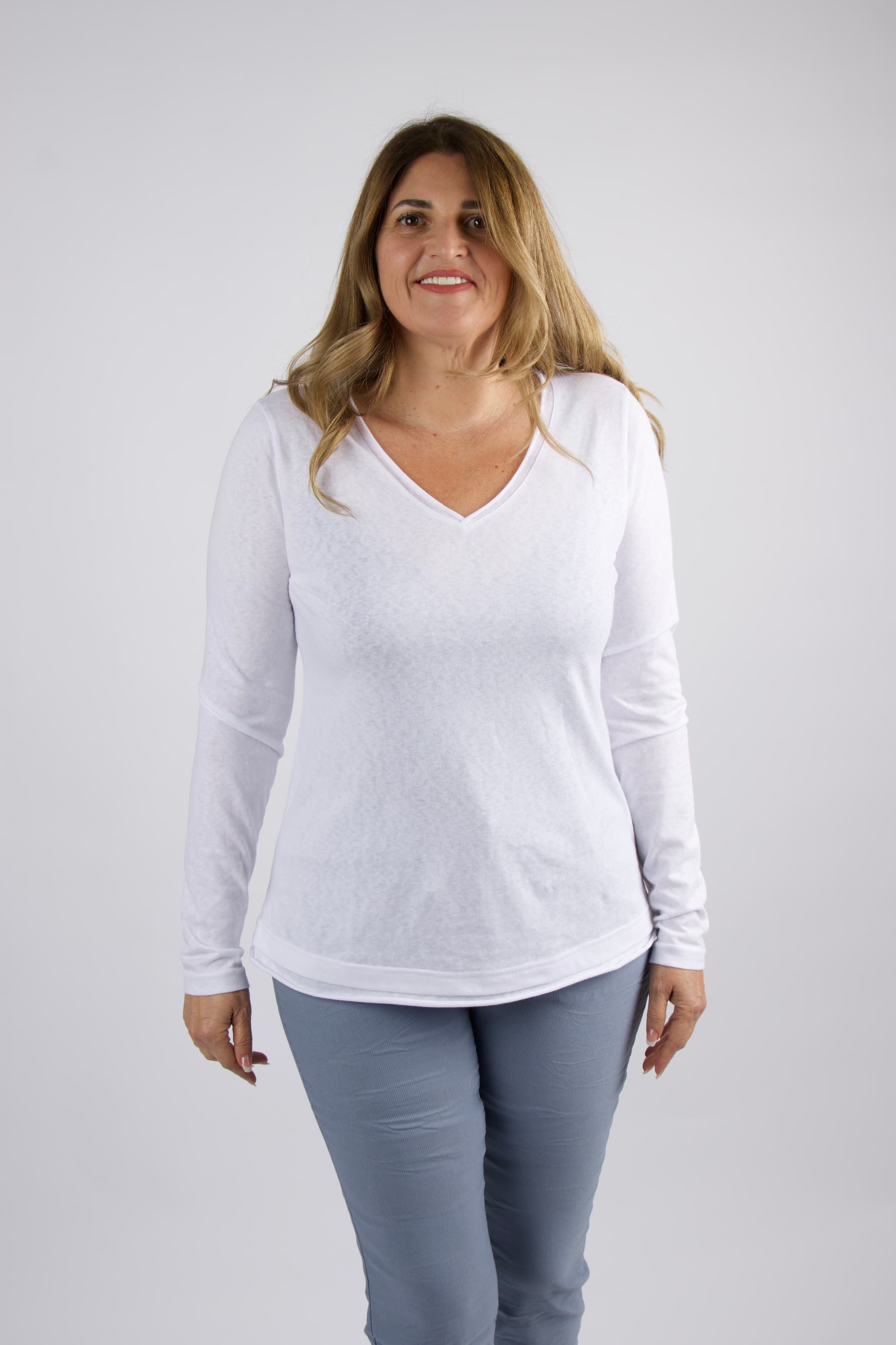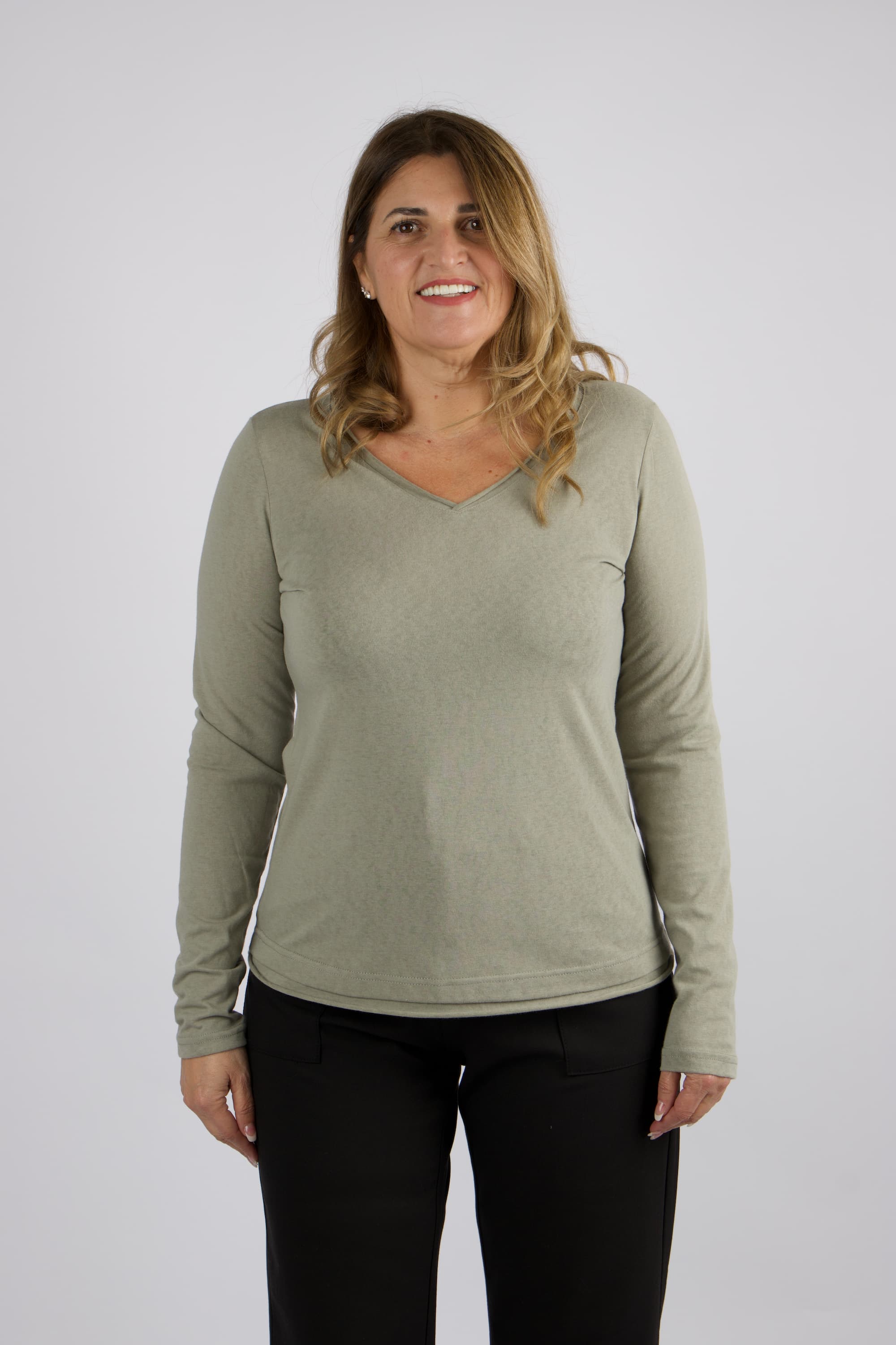 חולצת וי קלאסית ומינימליסטית שהופכת לבסיס מושלם לכל מלתחה. העיצוב הנקי והאלגנטי מציע מראה נינוח ומעודן שמתאים לכל סגנון ולכל אירוע.